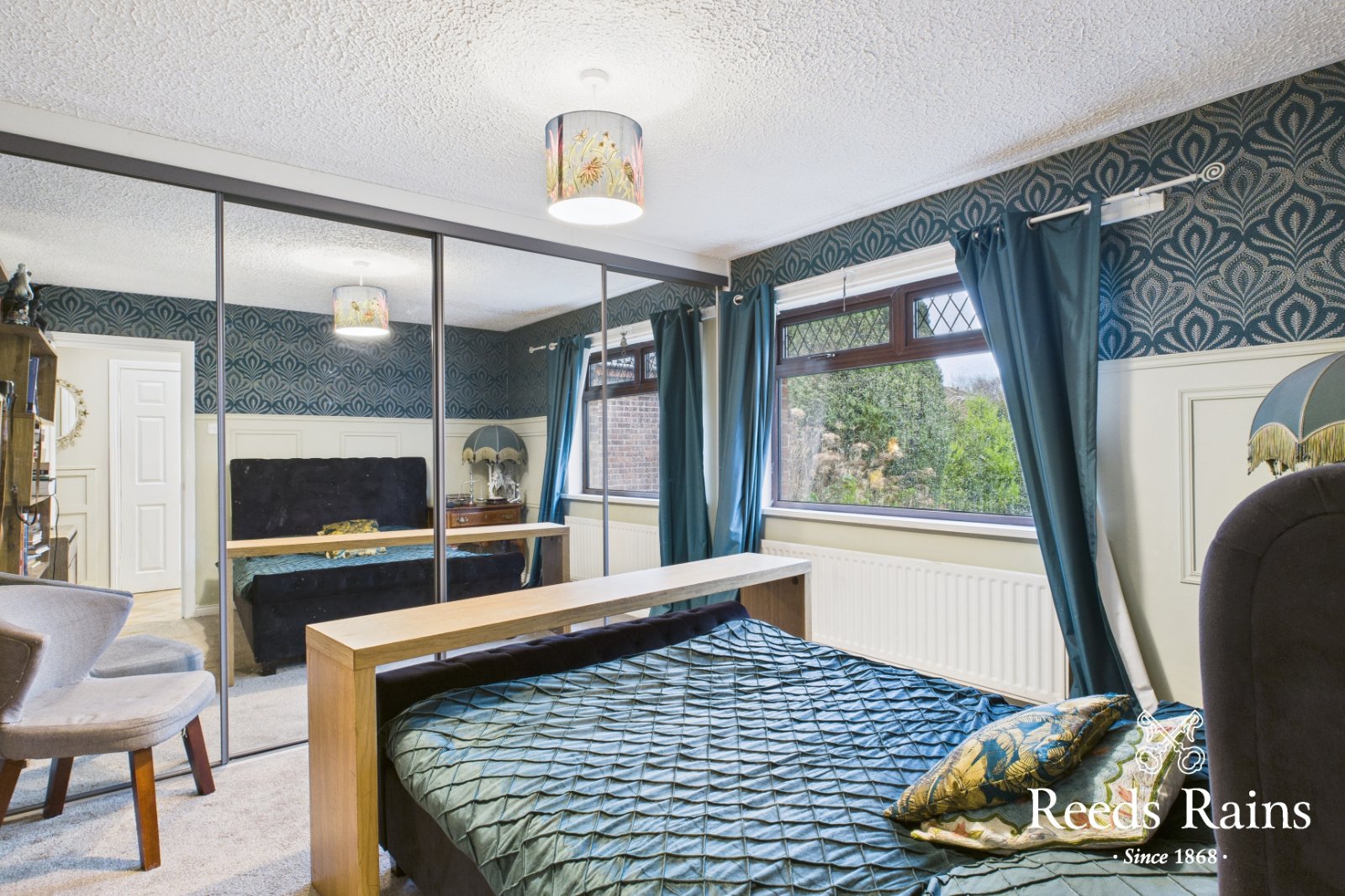 Floor to ceiling fitted robes with mirrored sliding doors. Part wood panelled walls.