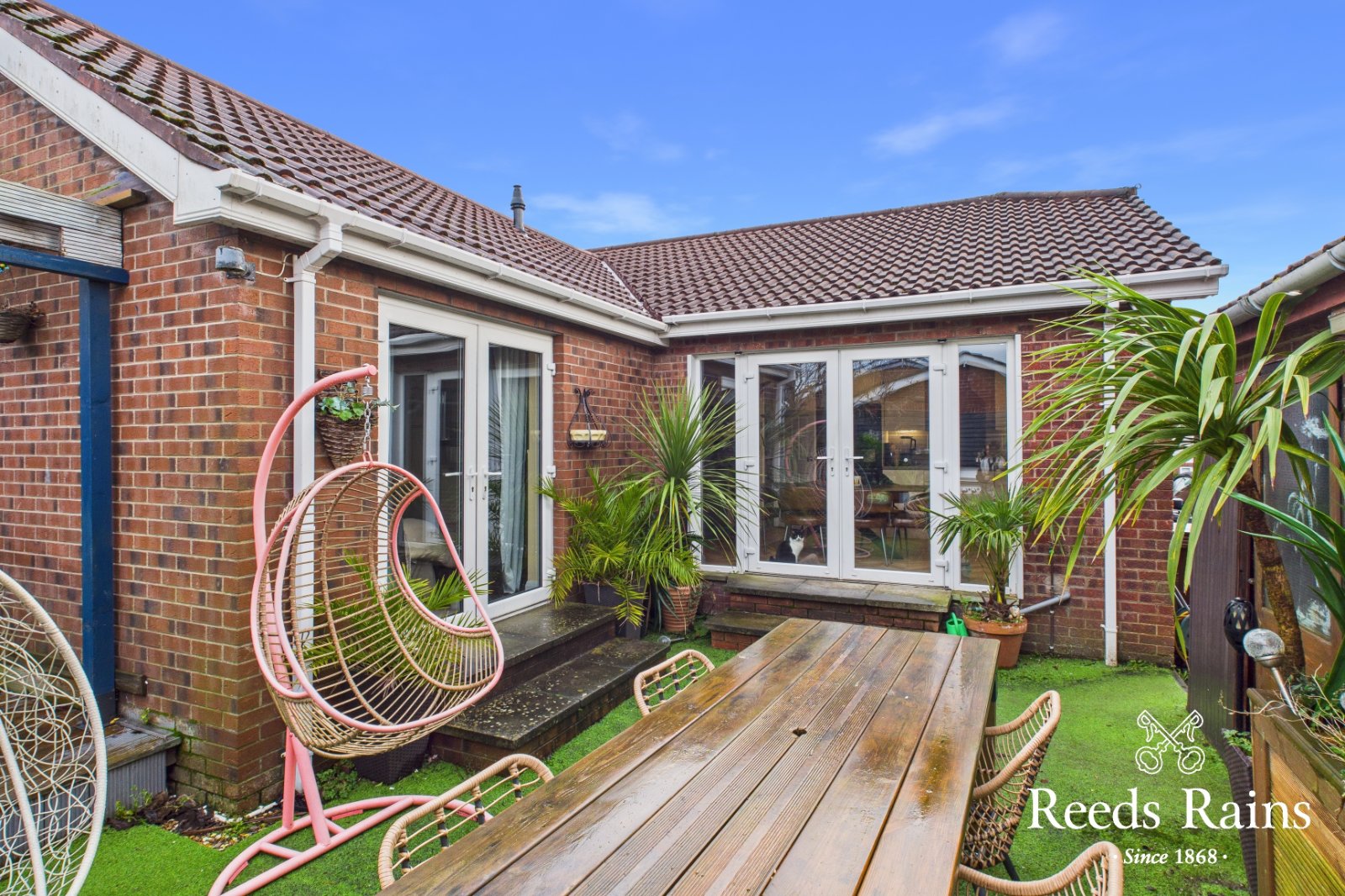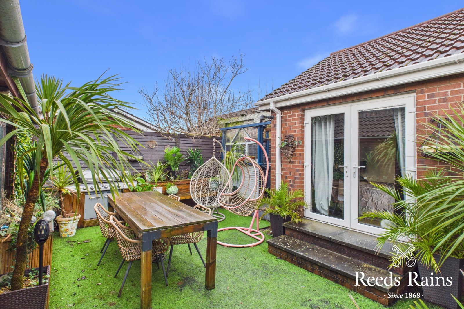 Low maintenance private rear garden laid in imitation grass.