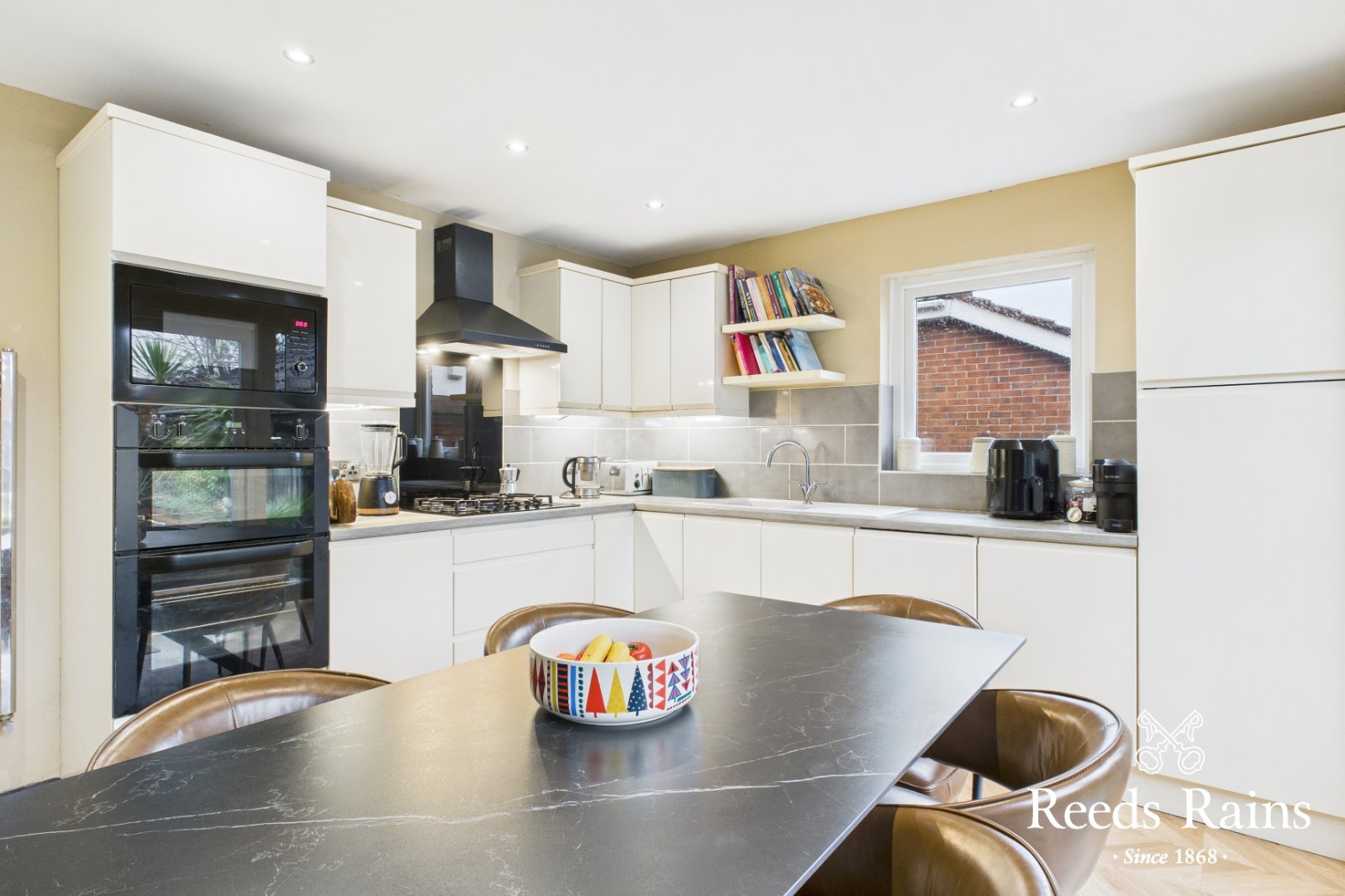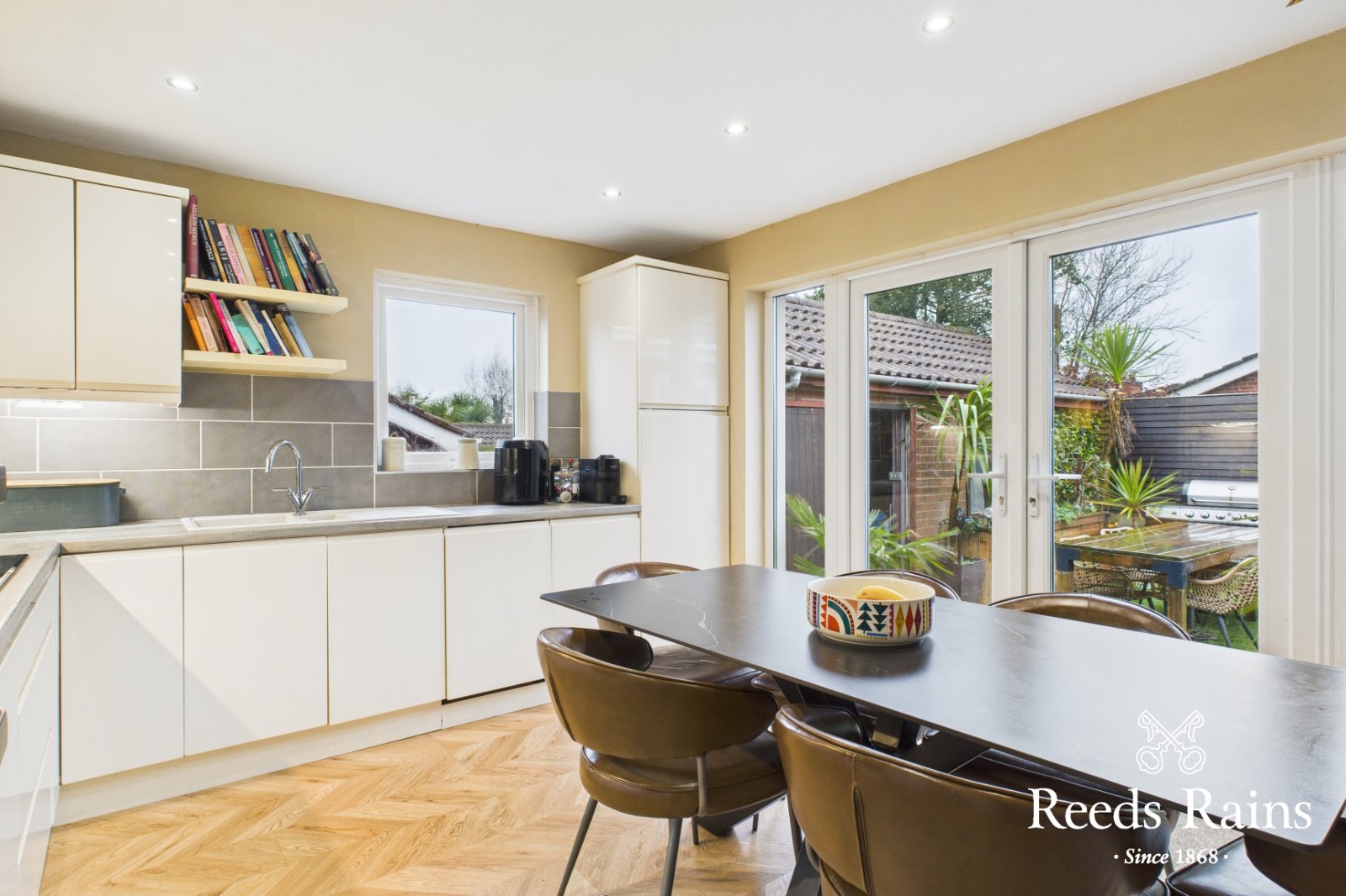 Modern range of fitted high and low level units. Built in gas hob and eye level oven with microwave above. One and a half bowl sink unit with mixer tap. Extractor fan. PVC double glazed French doors to rear garden. Spotlights. Part tiled walls.