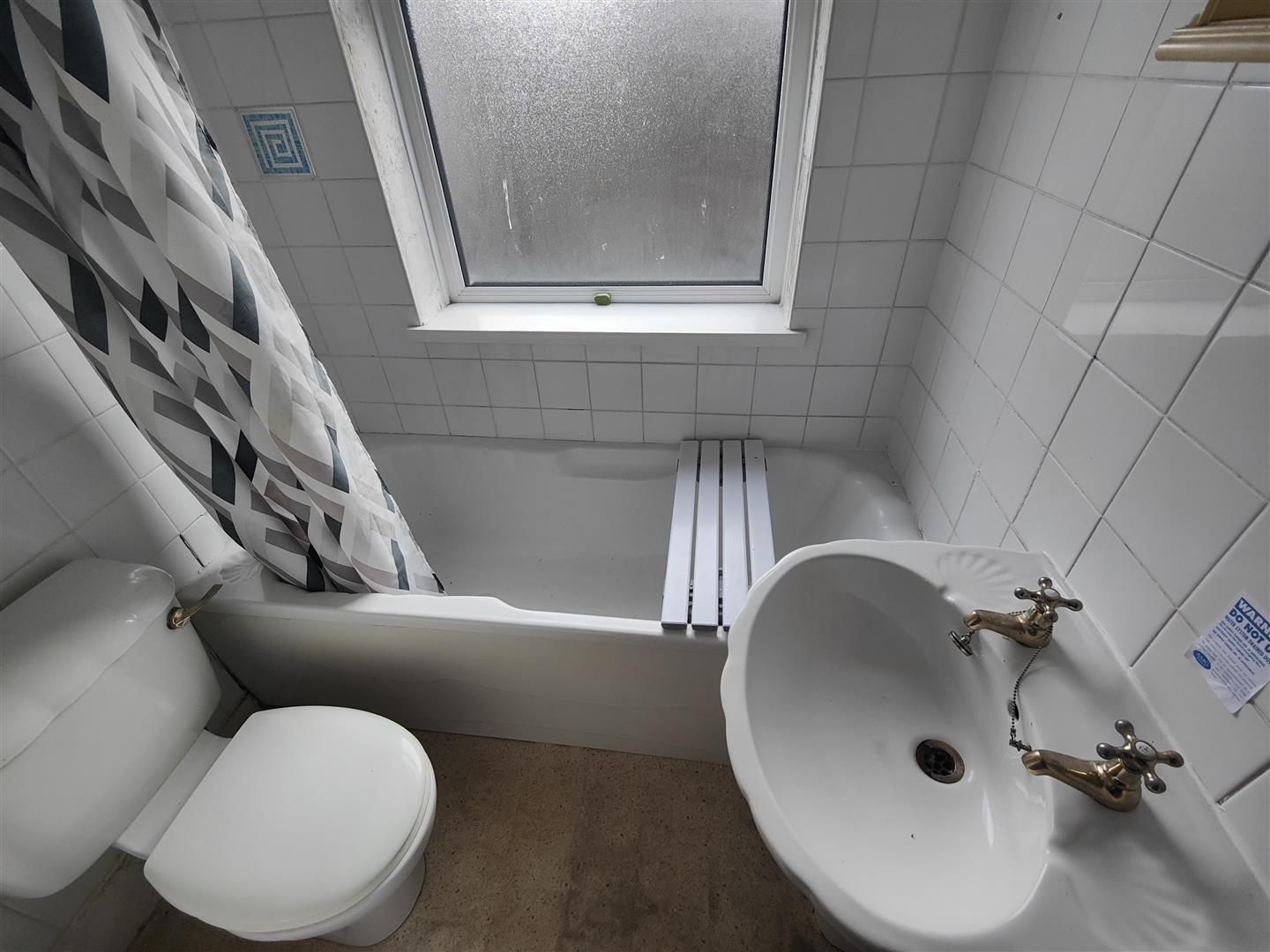 Classic white bathroom suite comprising panelled bath, telephone handset shower, pedestal wash hand basin, low flush wc, fully tiled walls.