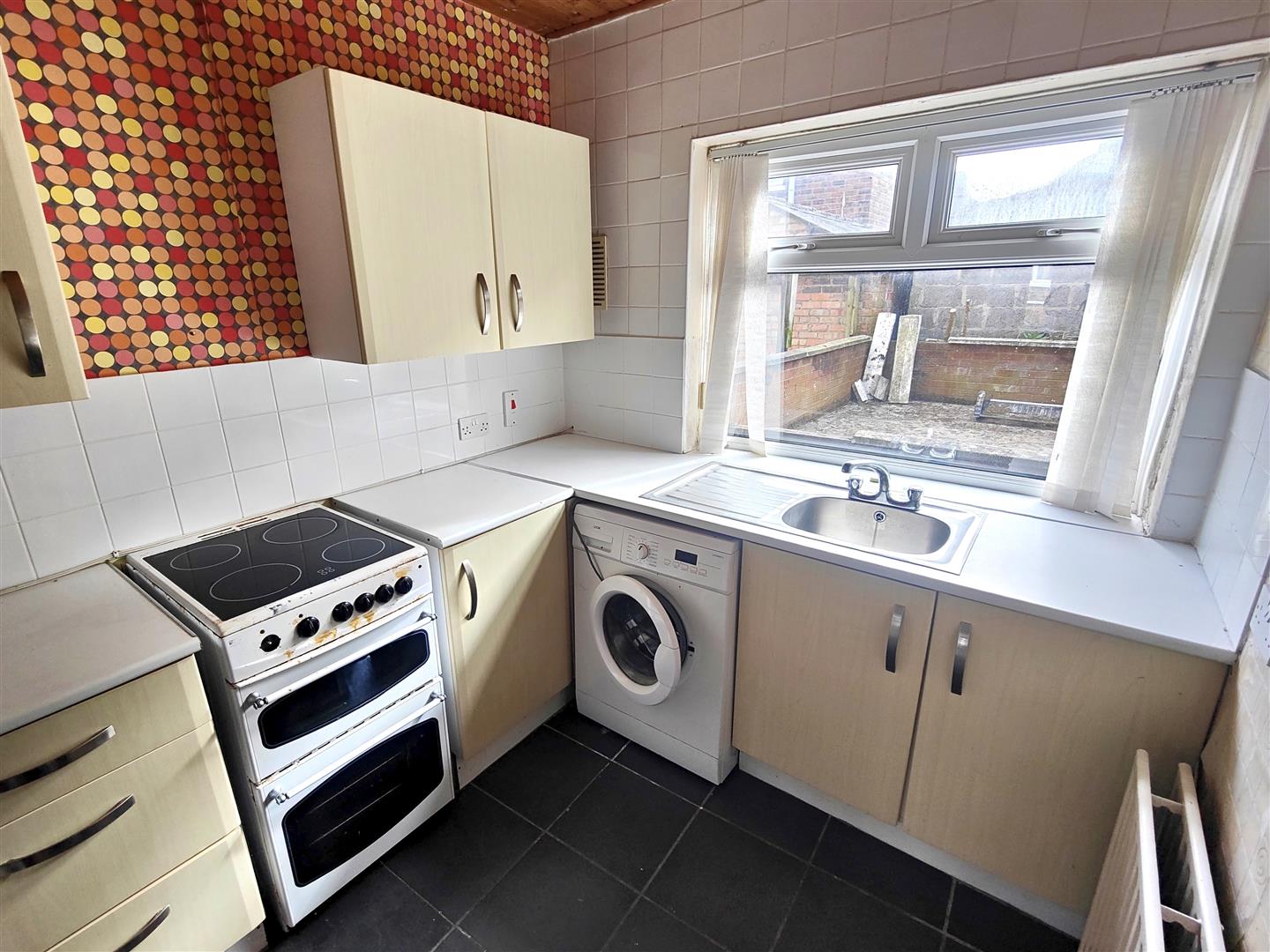 Single drainer stainless steel sink unit, range of high and low level units, formica worktops, cooker space, fridge/freezer space, plumbed for washing machine, pine tongue and groove ceiling, partly tiled walls, ceramic tiled floor, double panelled radiator.