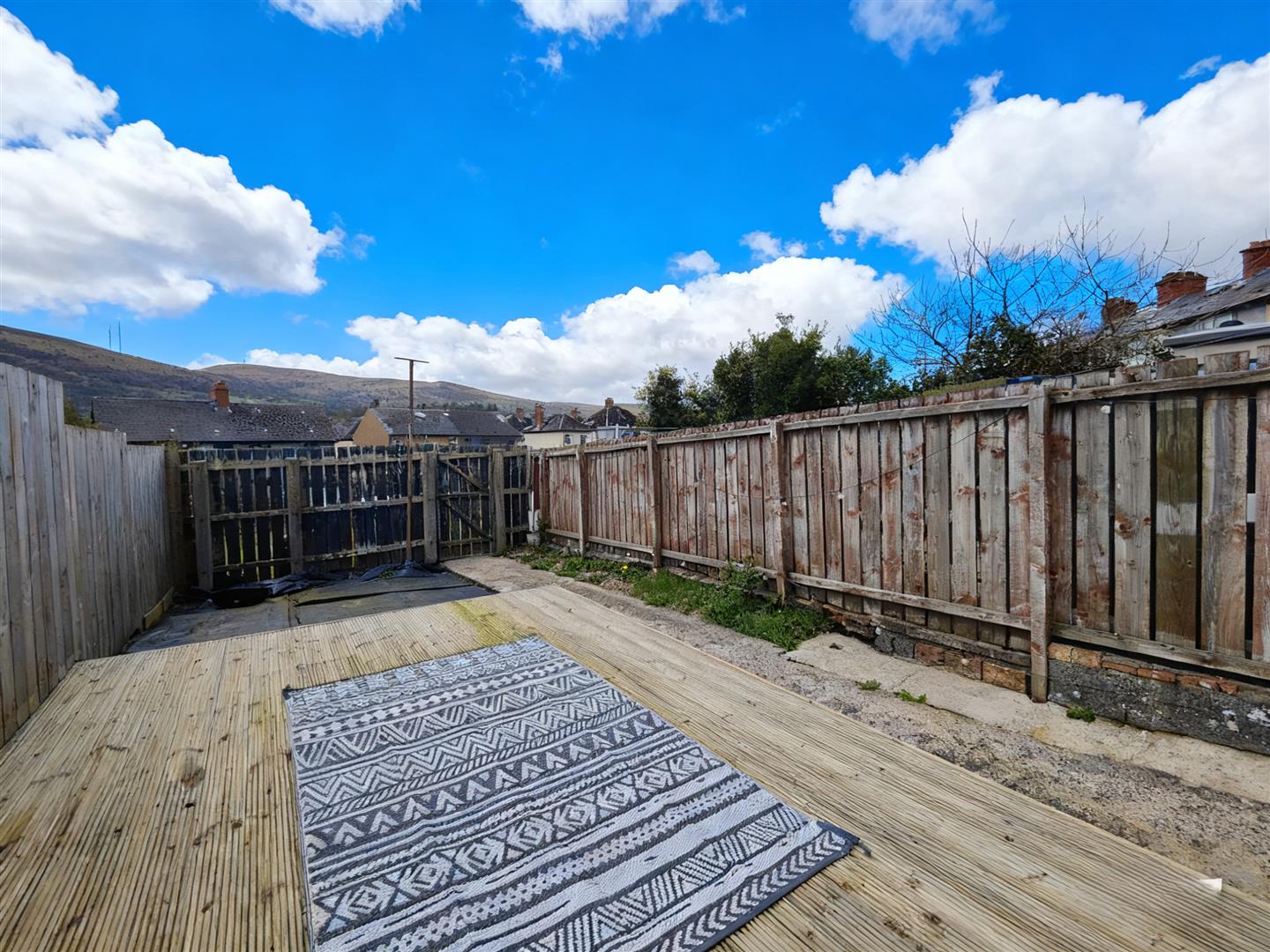 Front garden in mature lawn with hard landscaped rear garden, decking, outside light and tap.