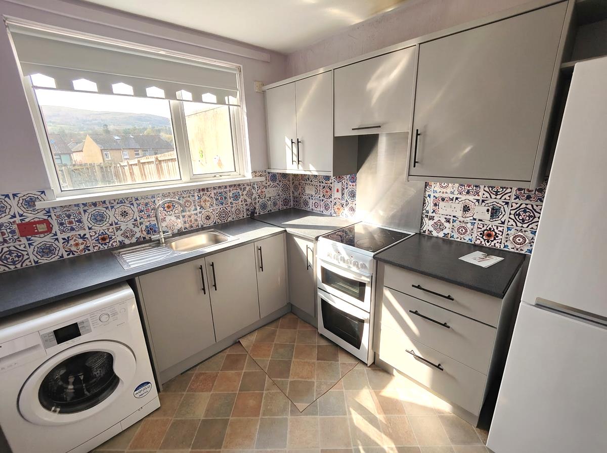 Single drainer stainless steel sink unit, range of high and low level units, formica worktops, cooker space, stainless steel splash back, integrated extractor, fridge/freezer space, plumbed for washing machine, partly tiled walls, panelled radiator,