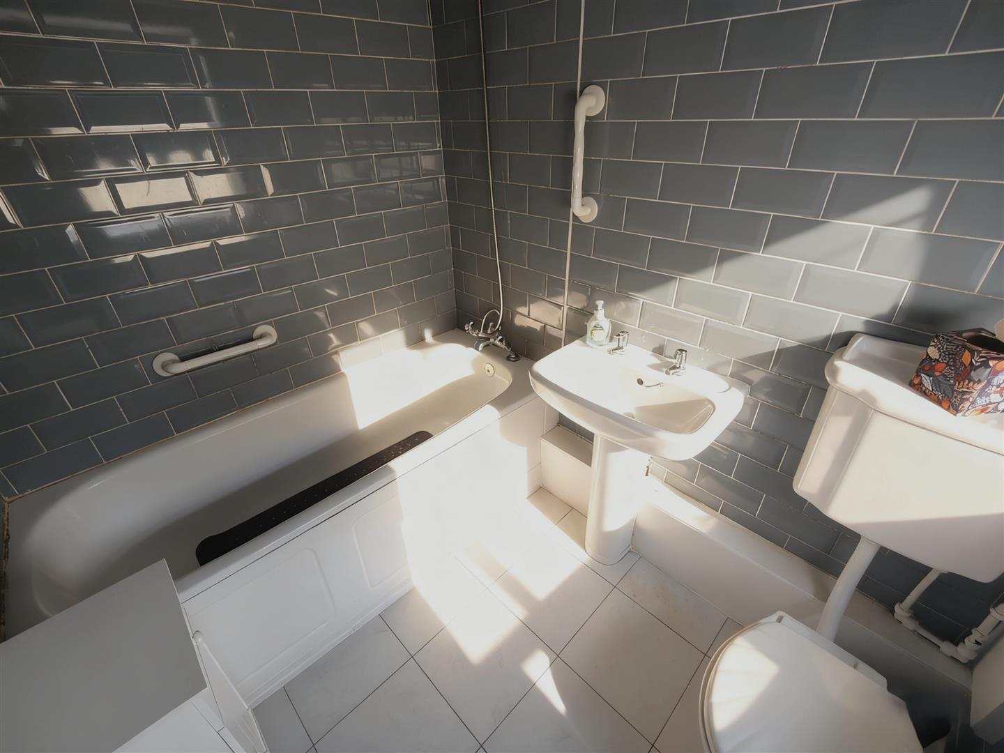 Fully tiled modern white bathroom suite comprising panelled bath, telephone handset shower, pedestal wash hand basin, low flush wc, tiled walls, ceramic tiled floor, extractor, panelled radiator.