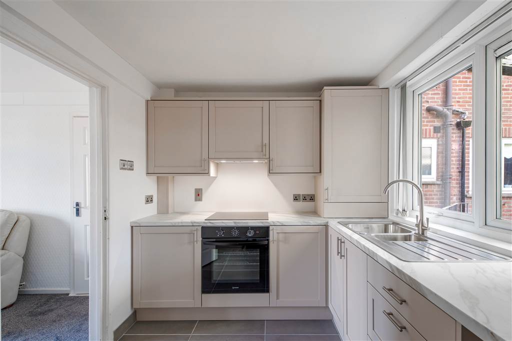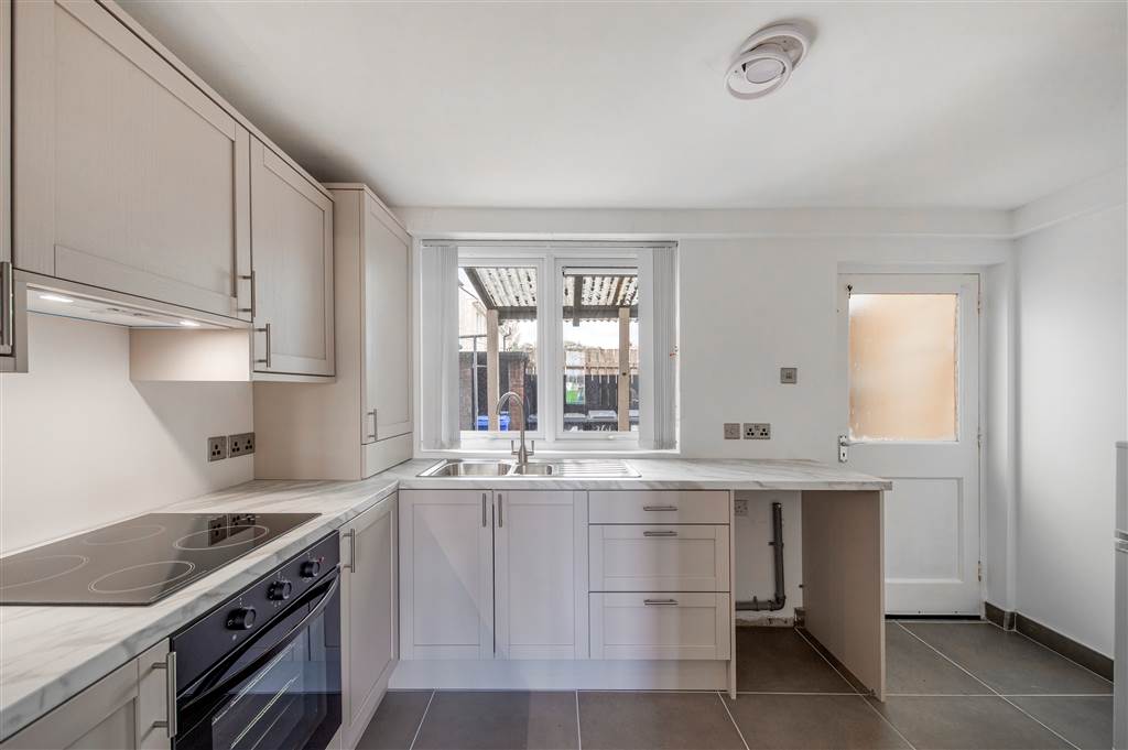 Excellent range of high and low level units, formica work surfaces, stainless steel sink unit with mixer taps, 4 ring ceramic hob and electric oven,stainless steel extractor fan, plumbed for washing machine, fridge freezer space, storage cupboard, double panelled radiator, gas fired central heating boiler, door to rear.