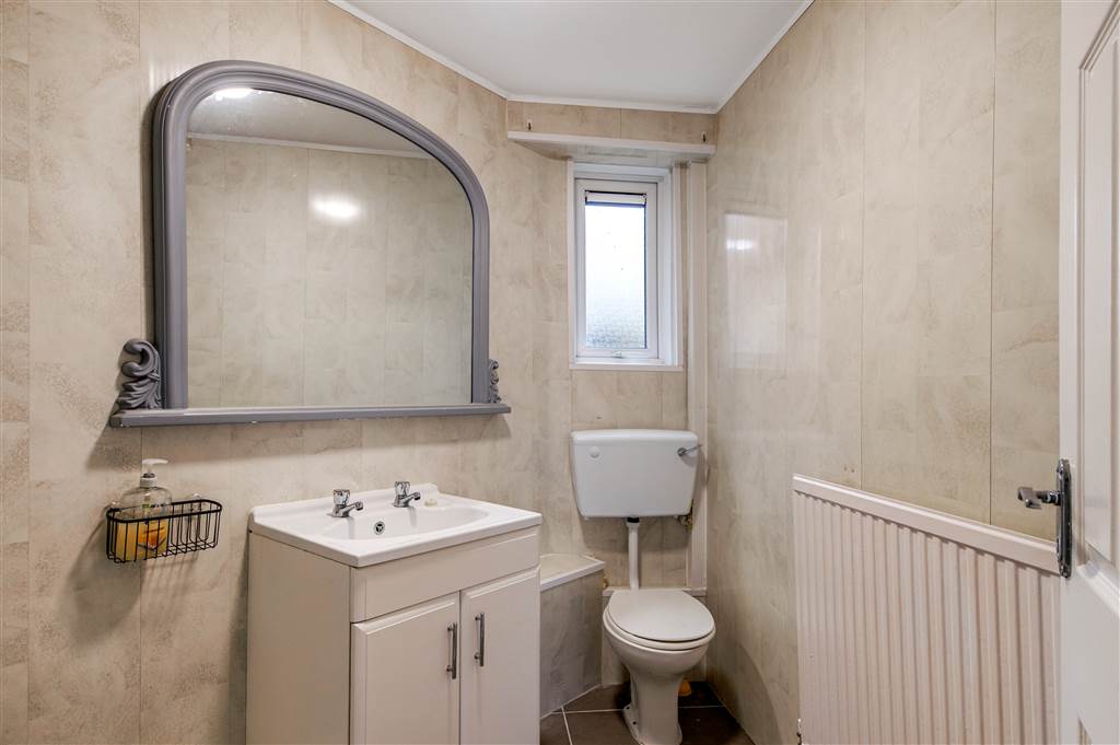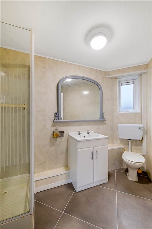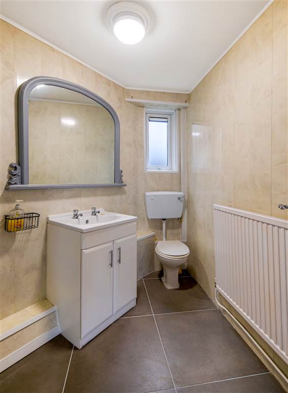 White suite comprising of electric shower, pedestal wash hand basin, low flush w.c, PVC tiled walls, ceramic tile flooring, panelled radiator.