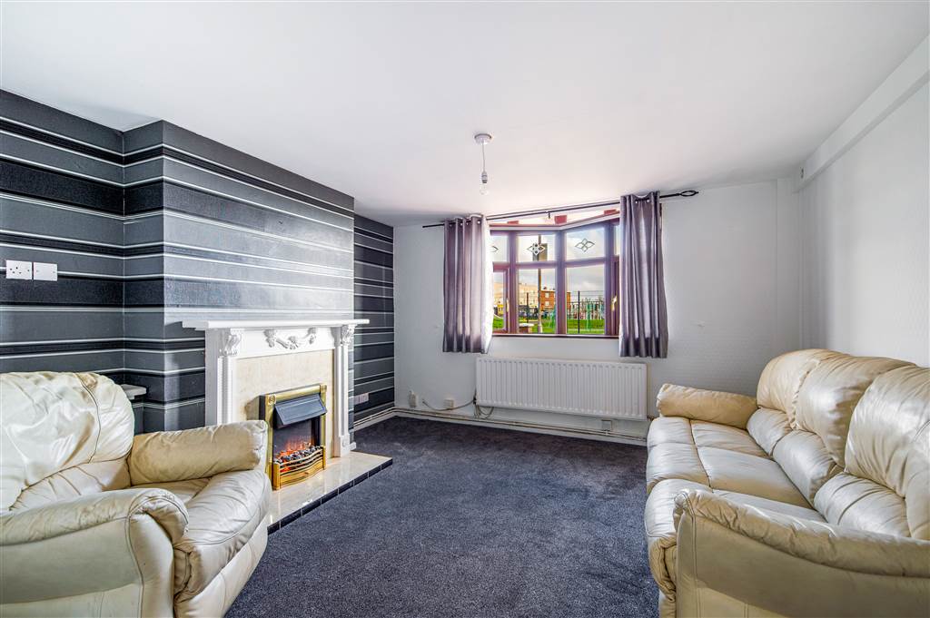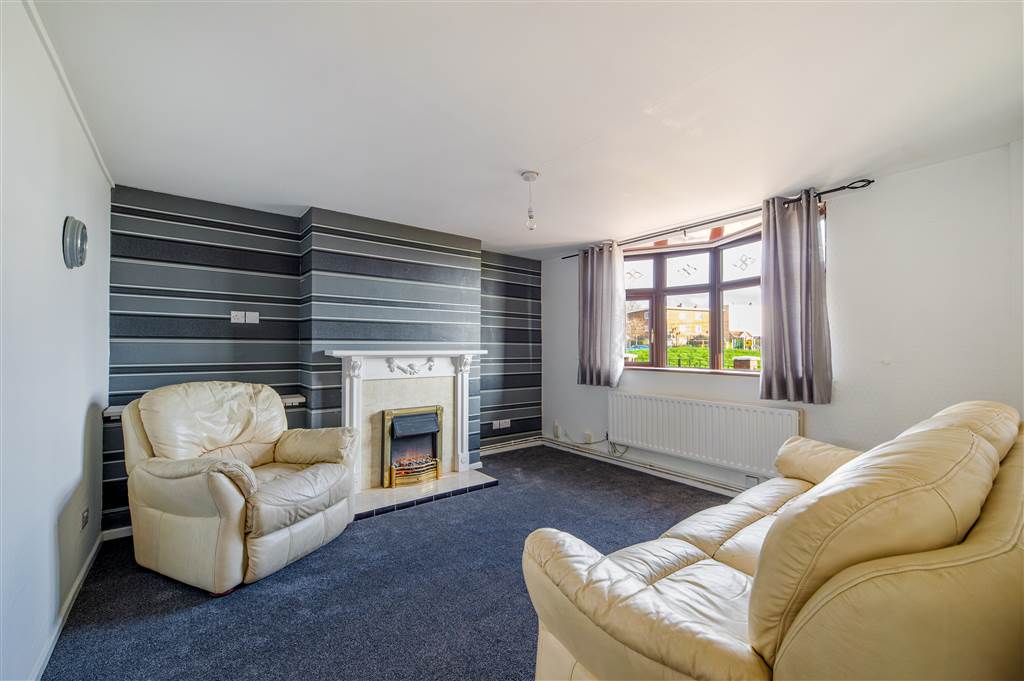 Attractive fireplace with wood surround, tiled inset and heath, electric fire, bay window, double panelled radiator.