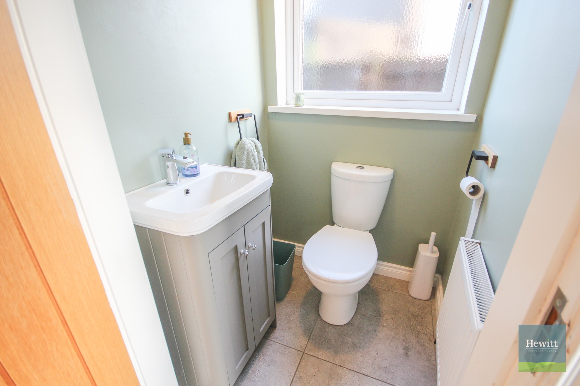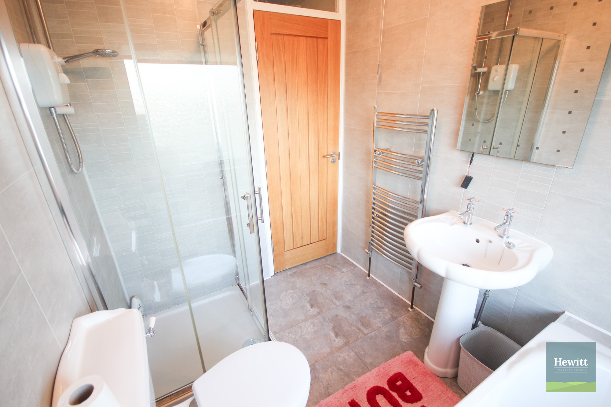 Shower. WC. Wash hand basin. Heated towel rail. Panelled shower. Tiled backsplash.