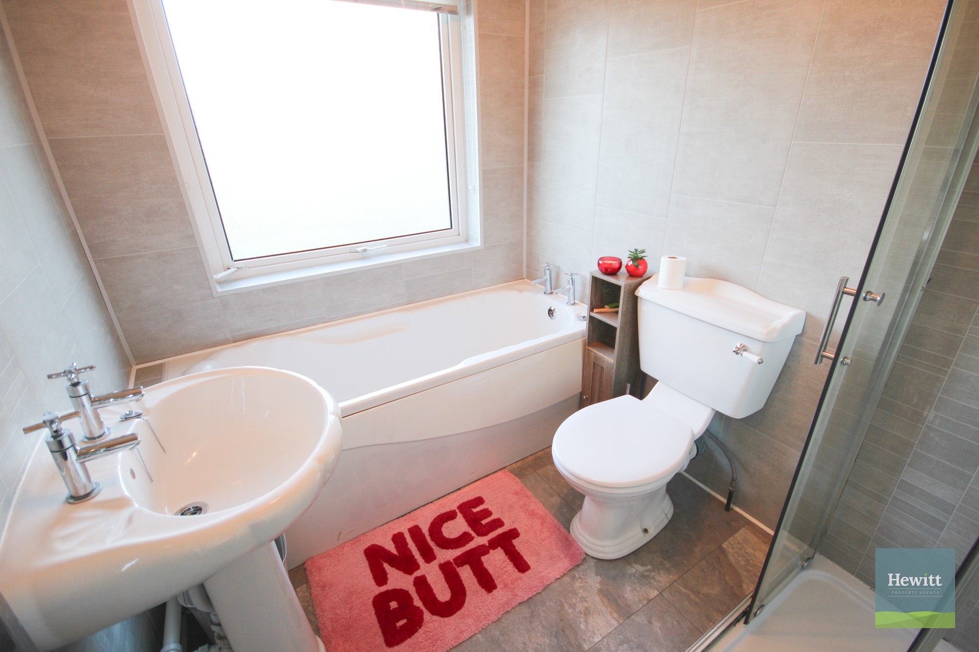 Tile effect linoleum floor. Bath. Shower. WC. Wash hand basin.