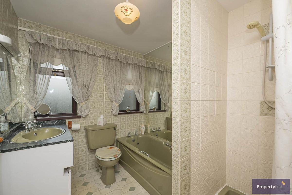 Four piece suite to include electric shower, panel bath, low flush WC, sink in vanity and ceramic tiled floor and walls.