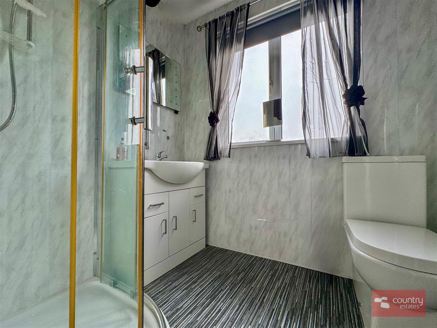 Comprising button flush wc, modern vanity unit with mono block tap. 1/4 Rounded shower cubicle with pvc panelling and electric shower unit. PVC panelled ceiling with recessed low voltage lighting. Marble effect PVC panelled walls.