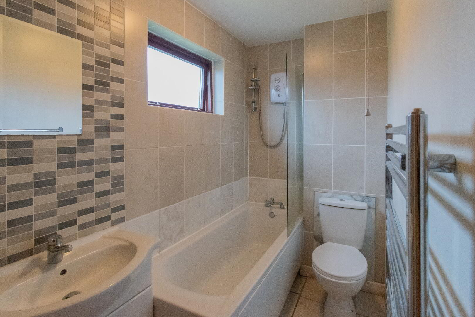 BATHROOM with modern three-piece suite to include low flush WC, wash hand basin and bath with electric shower over.