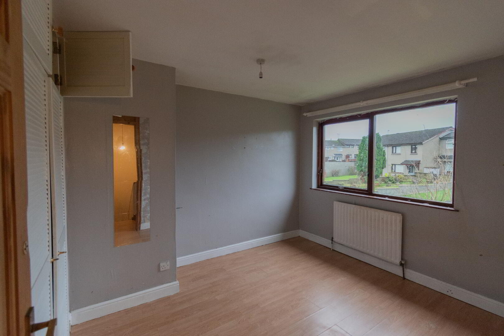 BEDROOM ONE with laminate flooring and front aspect, built-in storage.