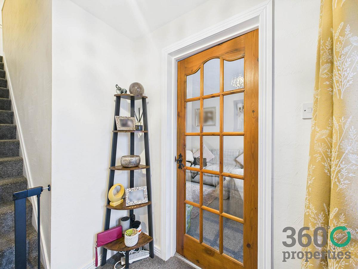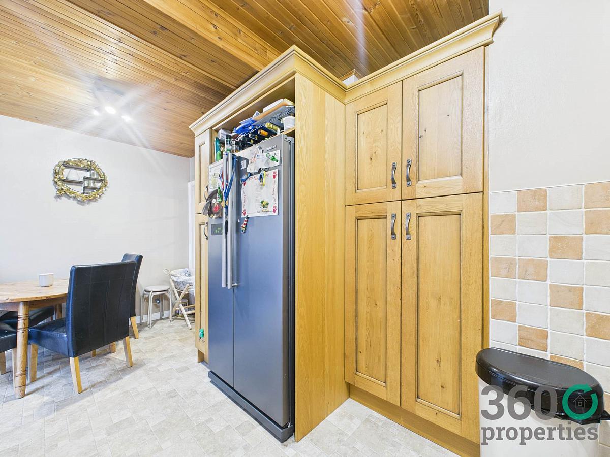 Range of eye and low level Oak shaker style units with black speckled work top. Stainless Steel sink with drainer bay and mixer tap. Integrated appliances include Creda oven and hob with stainless steel extractor fan over. Space for American style fridge/freezer. Plumbed for dishwasher and washing machine. Partly tiled walls. French doors to rear. Linoleum floor.