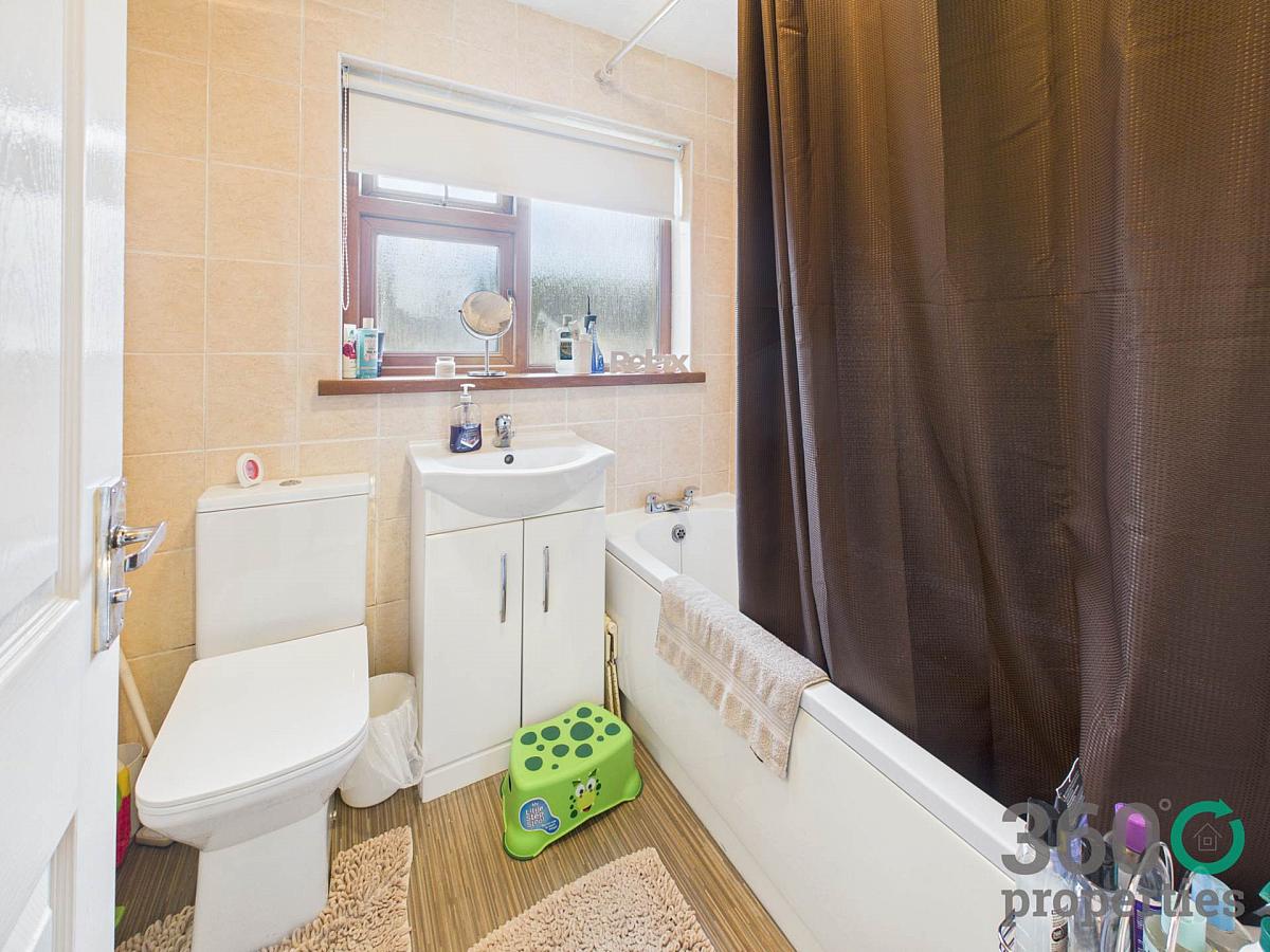 Three piece suite comprising of low flush w/c, vanity wash hand basin and bath with Triton electric shower over. Fully tiled walls. Linoleum floor.
