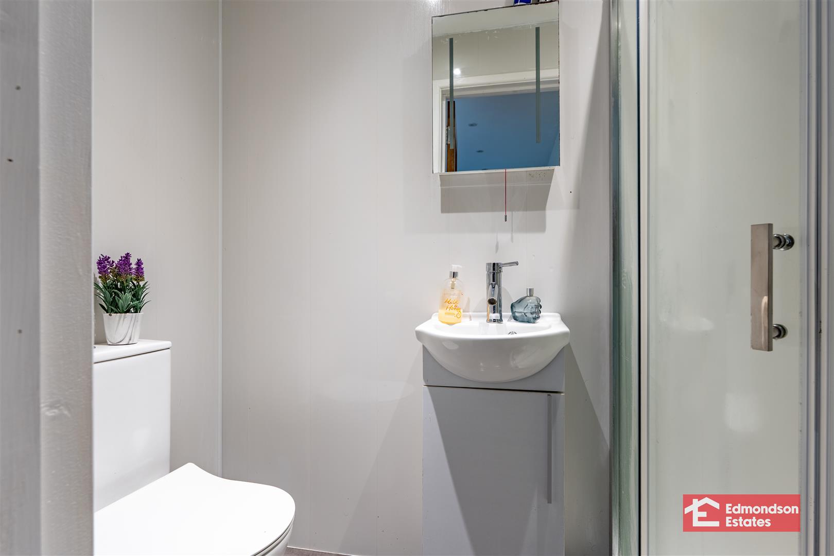 Modern fitted three piece suite comprising shower cubicle with electric shower over, vanity unit and WC. Fully panelled walls.