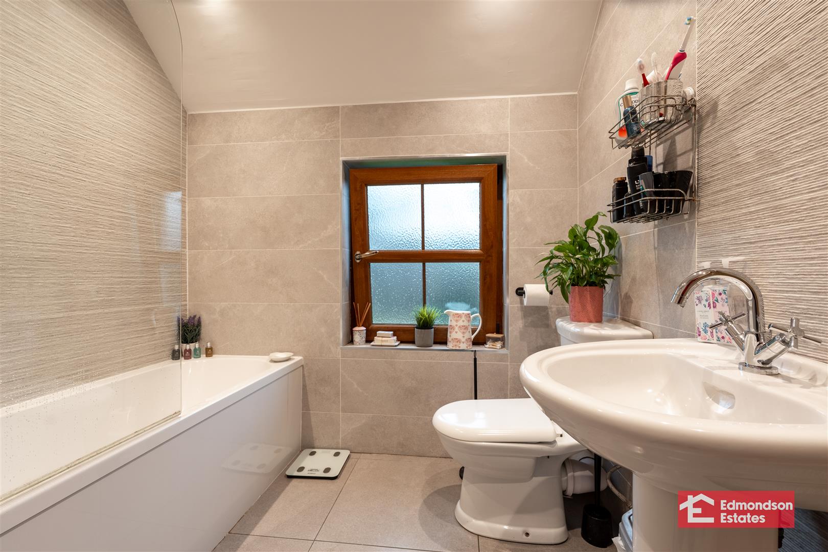 Modern fitted three piece suite comprising bath with electric shower over, wash hand basin and WC. Access to hot press. Fully tiled walls and tiled floor.