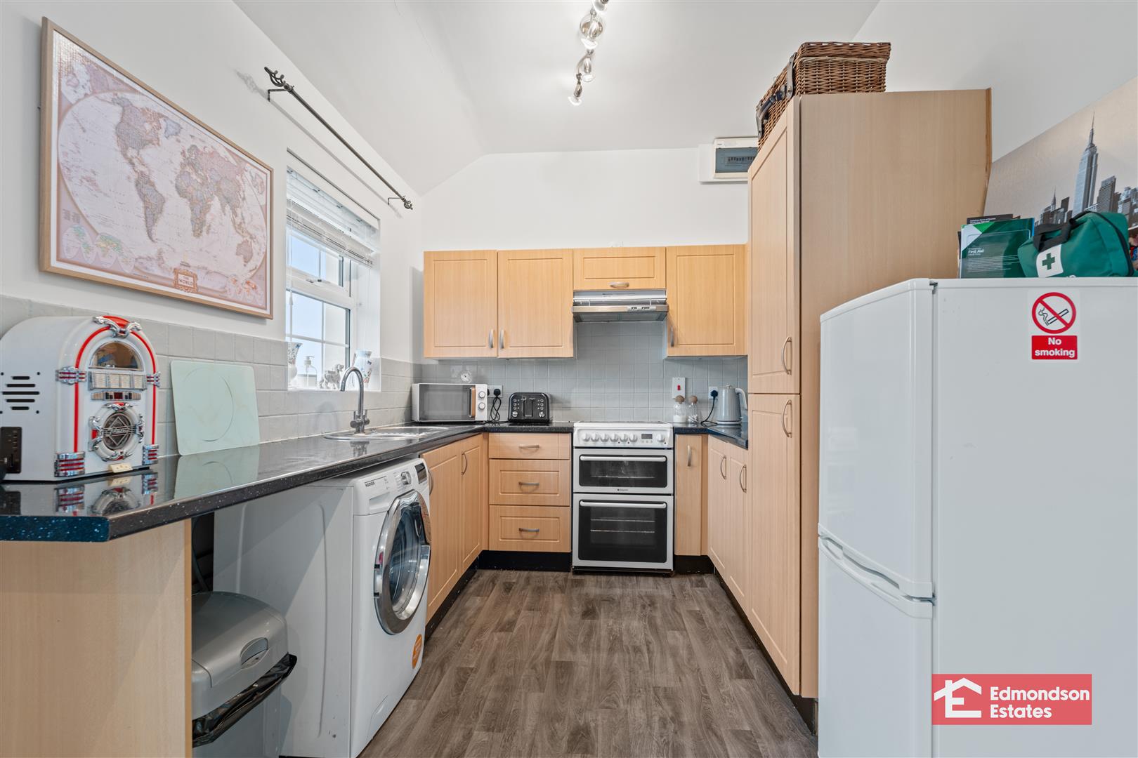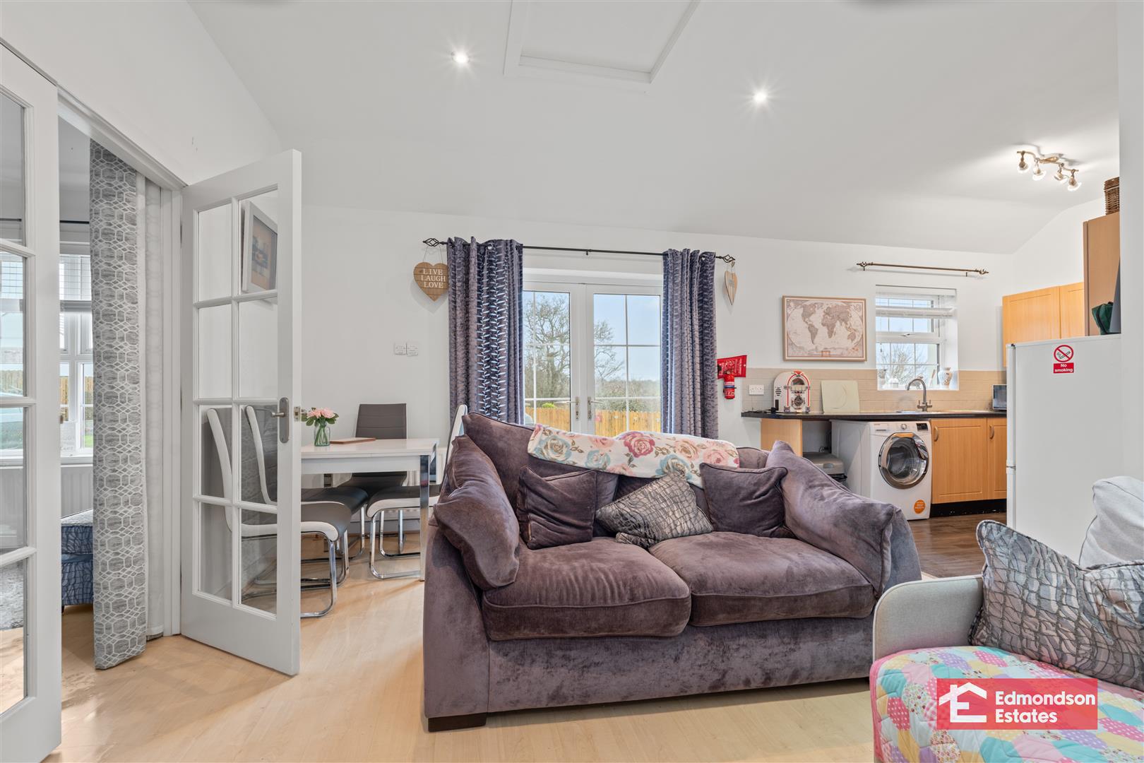 Integrated low level units and work surfaces. Sink unit. Space for washing machine and tumble dryer. PVC double glazed rear door. Internal door to garage.