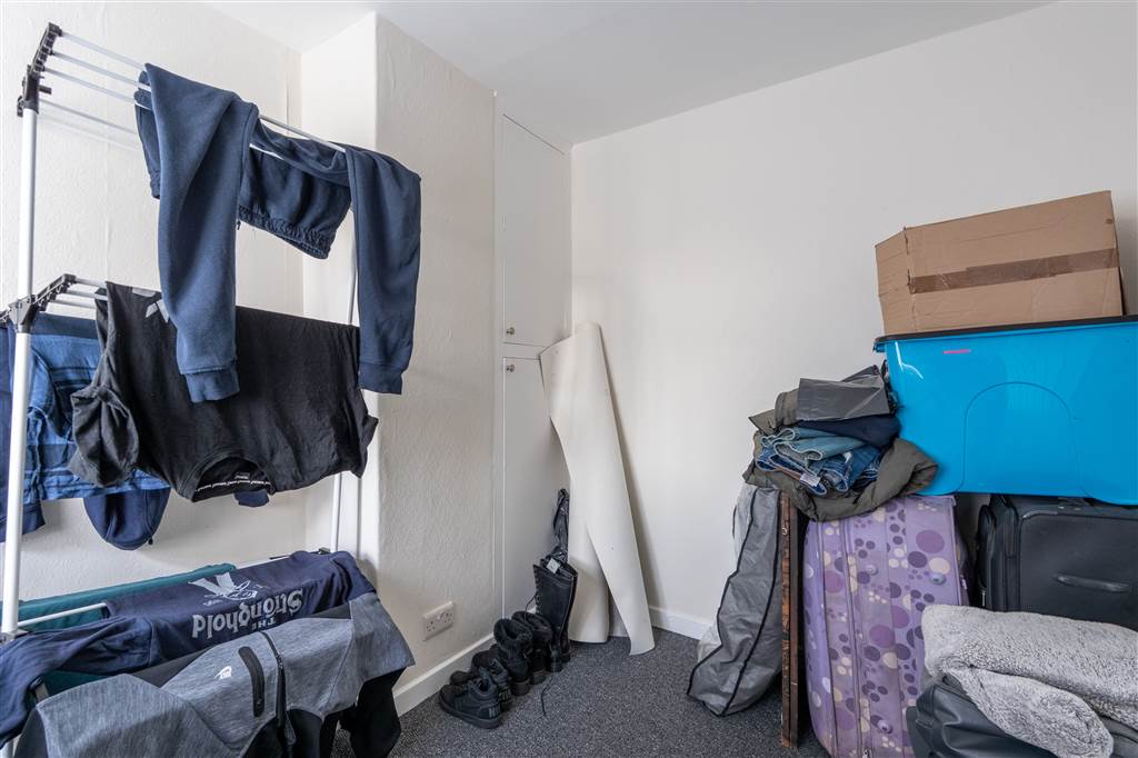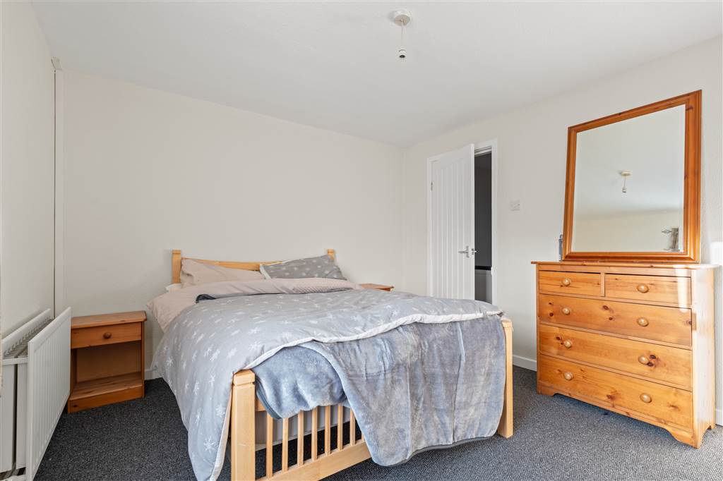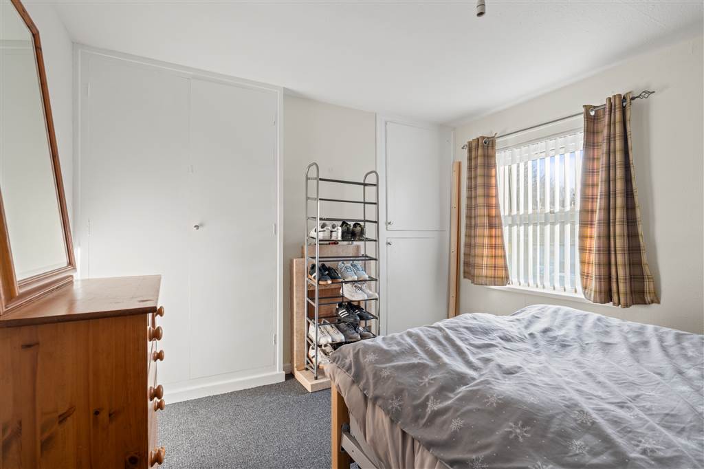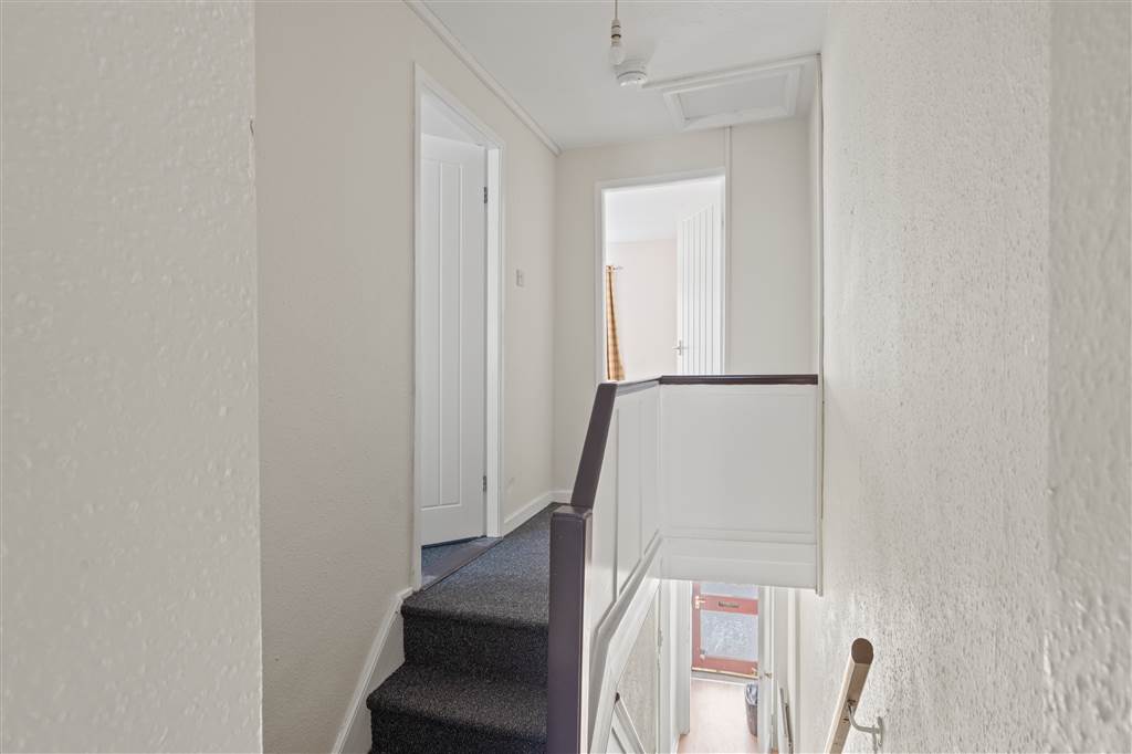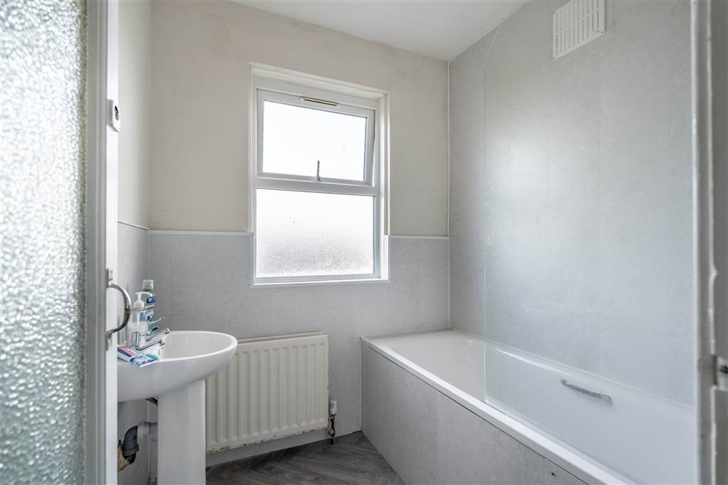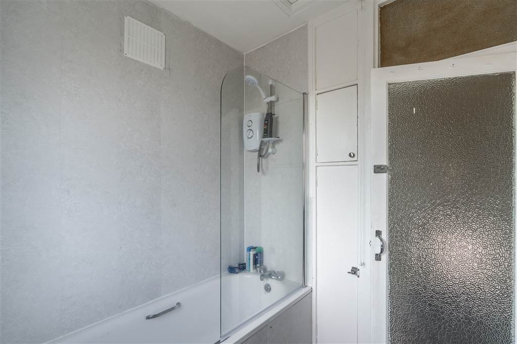 With WHB and panelled bath with shower over. Built-in storage cupboard. Access to loft.
