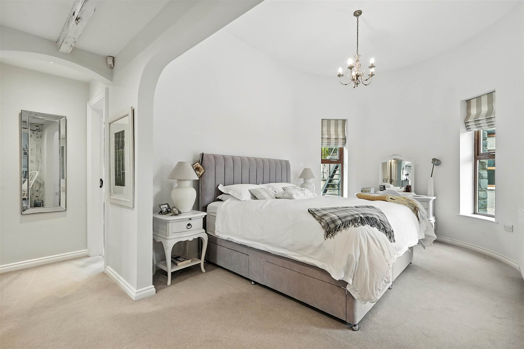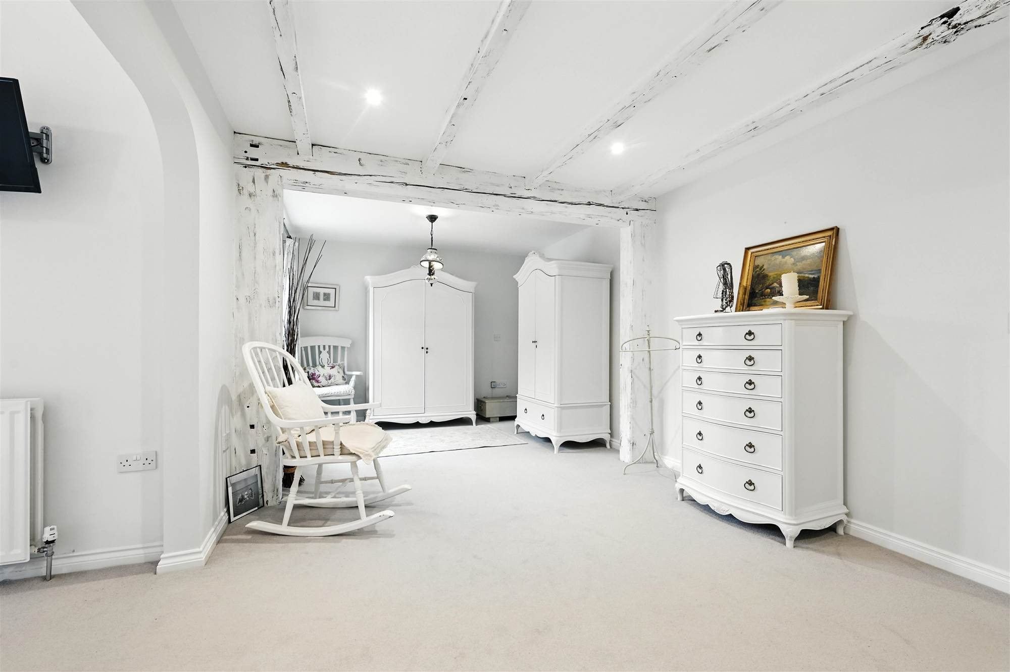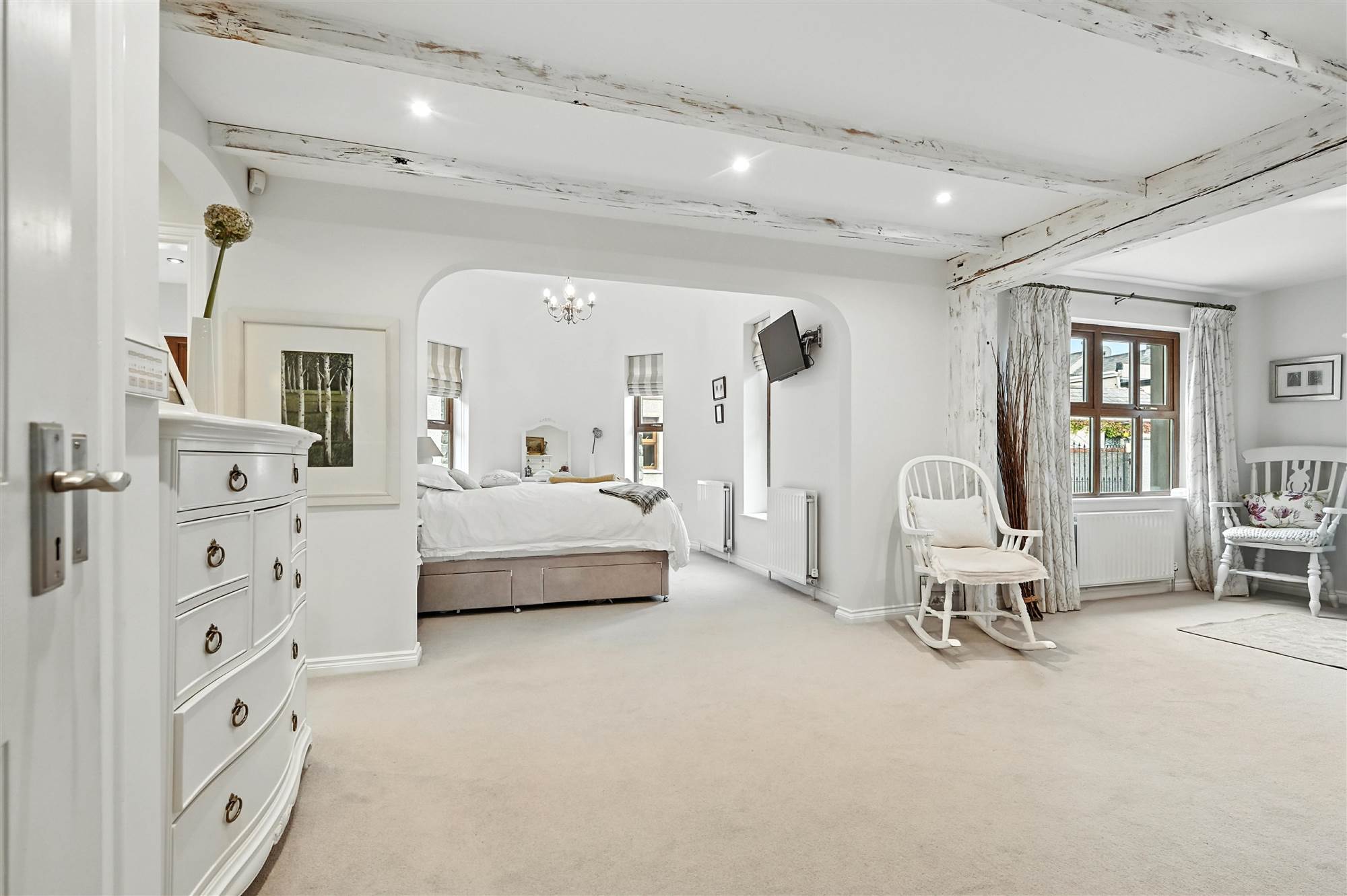 (at widest points). Large principal suite with feature exposed and treated timber beams. The luxurious sleeping area has been incorporated within the purpose built stone turret room with a raised ceiling height and triple aspect windows. The suite also includes a large dressing area, built in storage, recessed lighting.