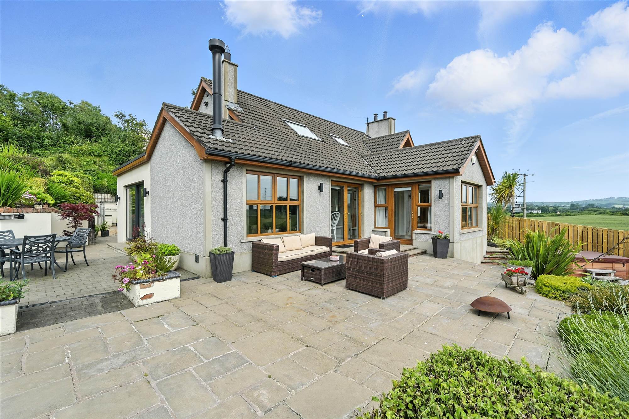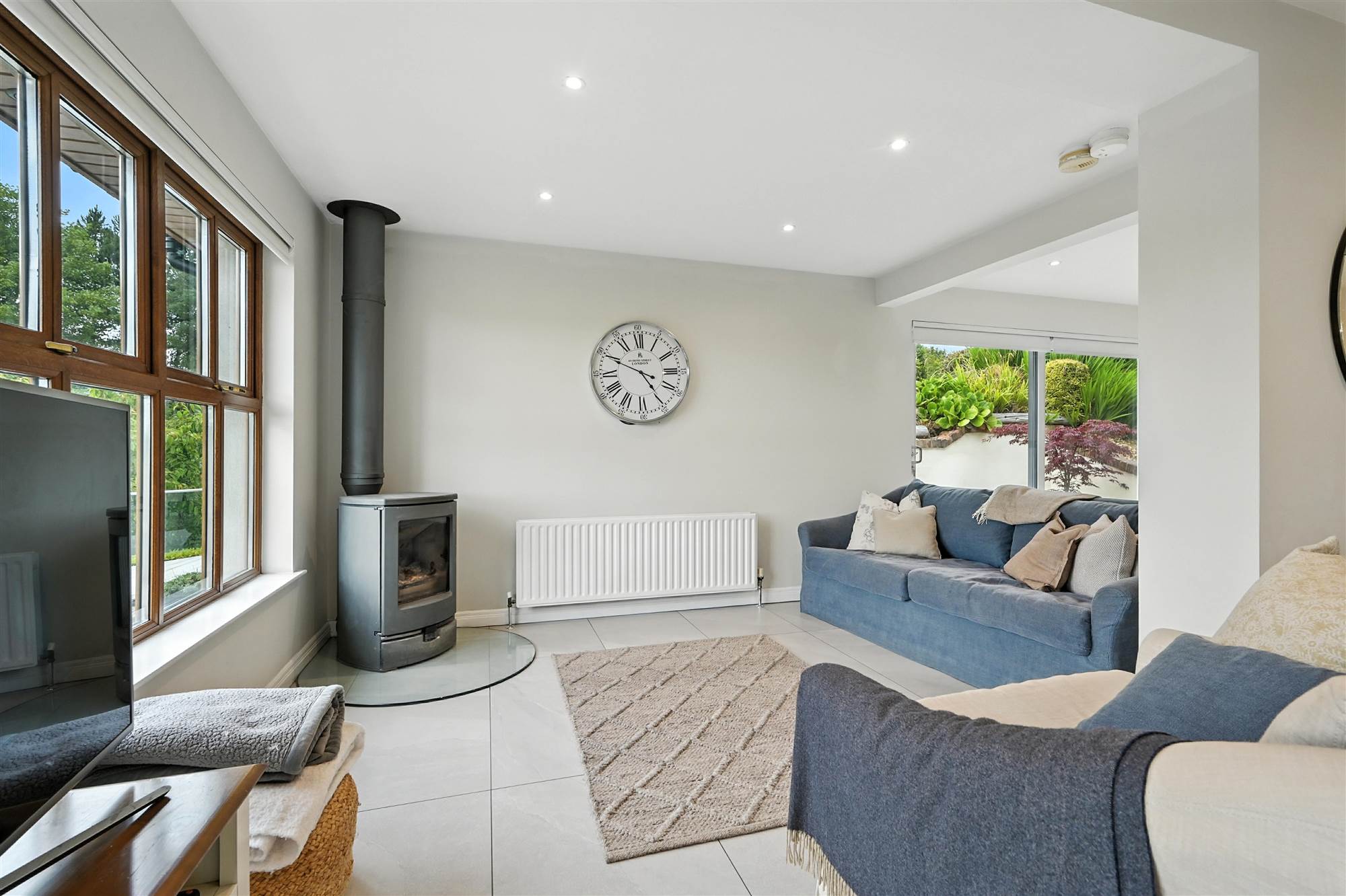 Finished to an exceptional standard throughout, the accommodation includes a welcoming reception hall leading to a stylish family living room with a striking brick fireplace and Stanley multi-fuel stove. The heart of the home is the expansive open-plan kitchen, living and dining area, featuring a bespoke solid wood in-frame kitchen with integrated appliances and a Charnwood multi-fuel stove. Patio and sliding doors open directly onto the south-facing garden, creating a seamless connection between indoor and outdoor living.