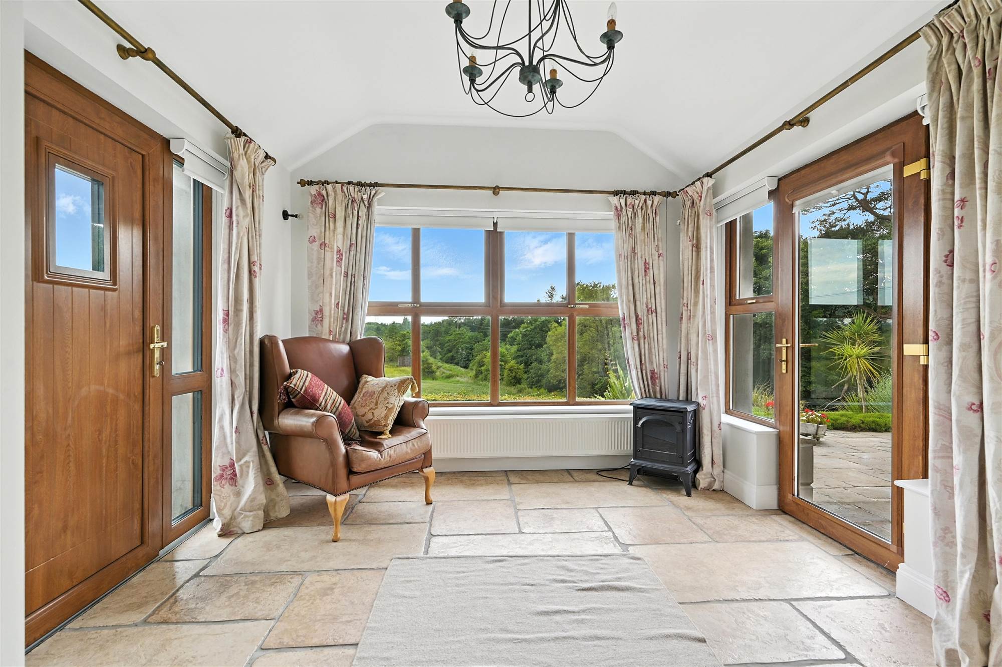 Double entrance doors, solid wood maple floor, custom built brick fireplace incorporating a Stanley Multi Fuel Stove with a back boiler linked to heating system.