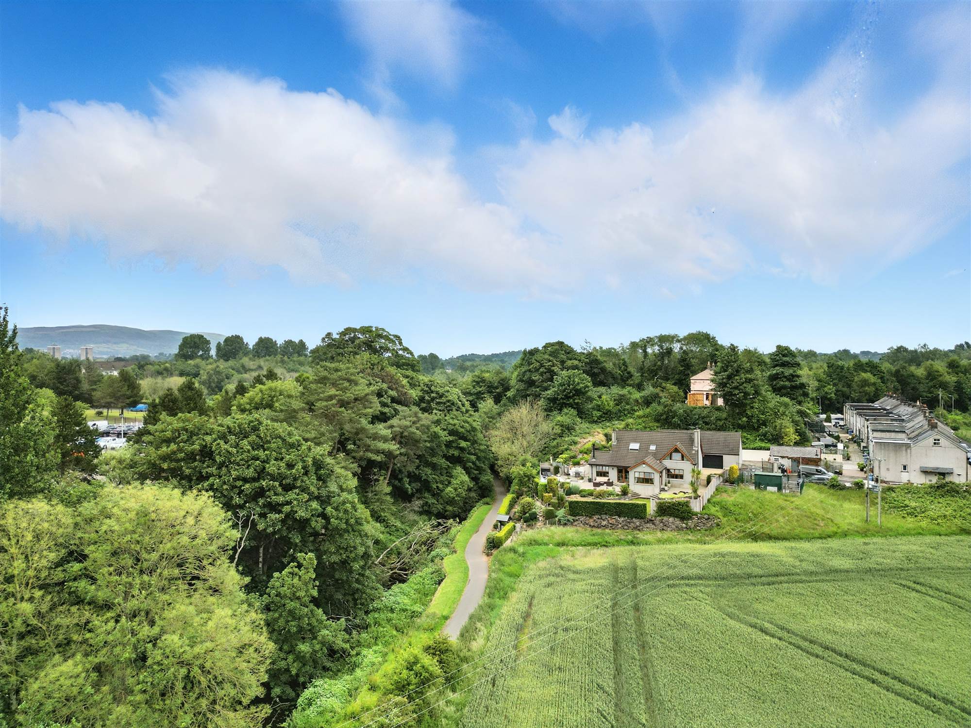 Mature, landscaped gardens including lawn surrounded by trees and shrubs, spacious patios, composite decked balcony enjoying Lagan Canal views and pathway to Lagan Tow Path. This home provides excellent connections to the gardens and surrounding Lagan Valley Regional Park for those who wish to enjoy inside/outside living and entertaining. Driveway with electric gates providing ample parking, space for EV charge point. Extensive use of outside lighting surrounding the property.