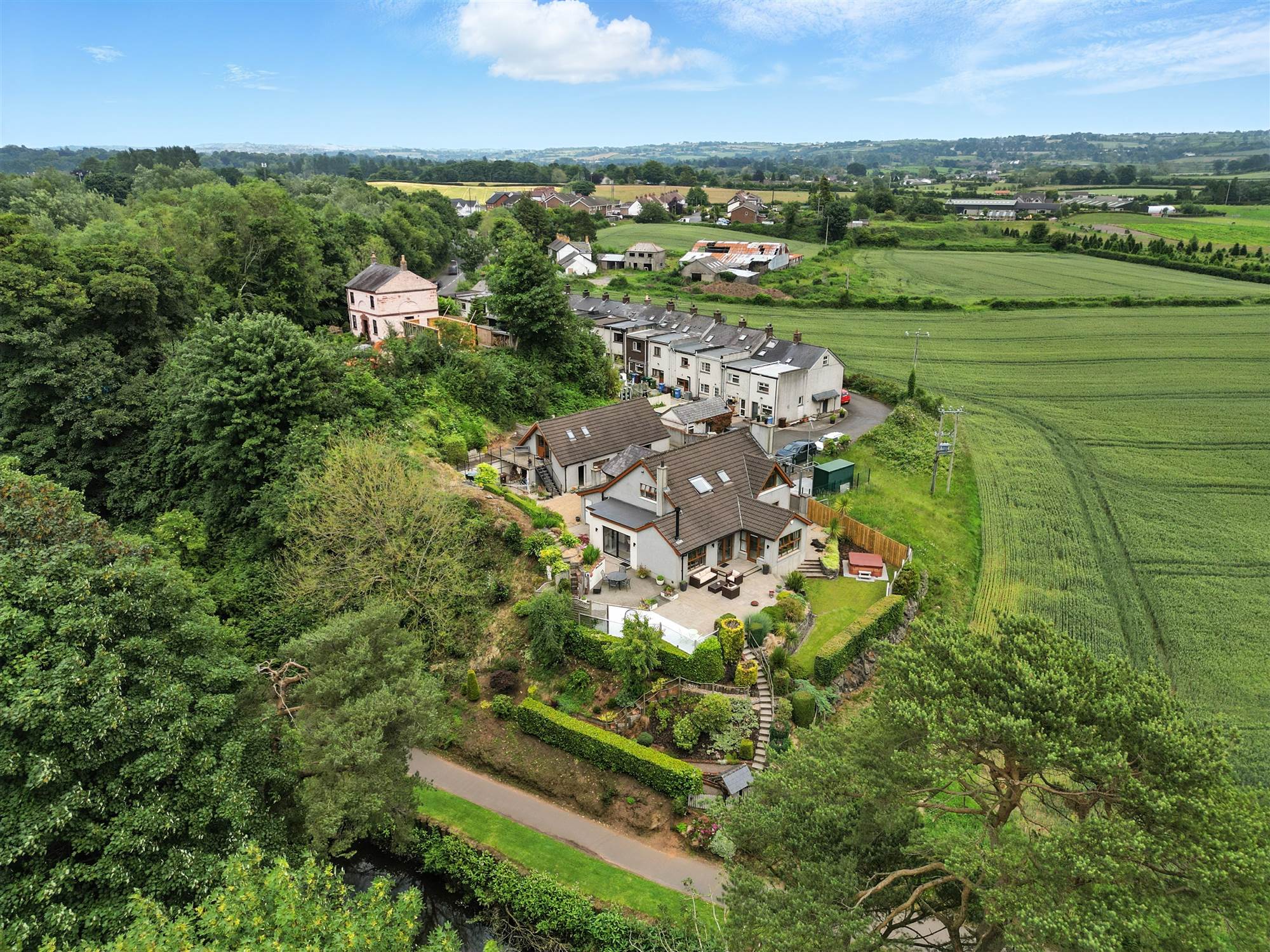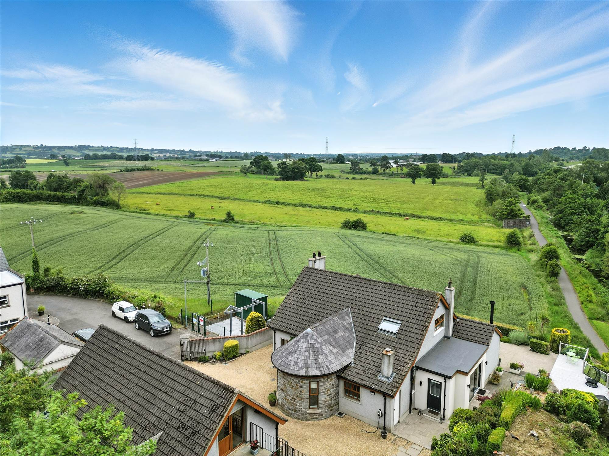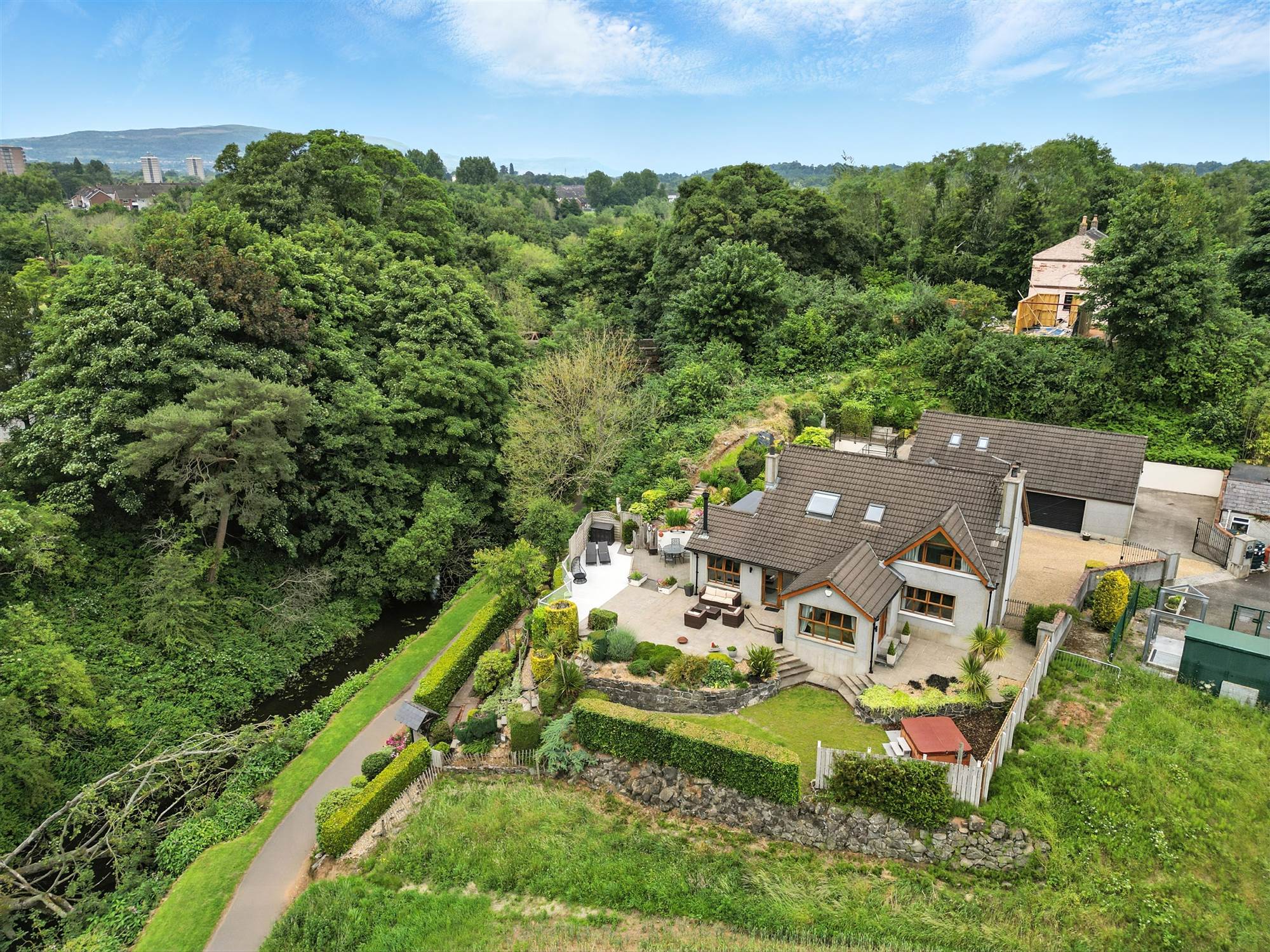 The beautifully landscaped gardens include paved patios, atmospheric lighting and an extensive composite deck, with private access onto the Lagan Tow Path, ideal for walking and cycling routes to Lisburn and Belfast.