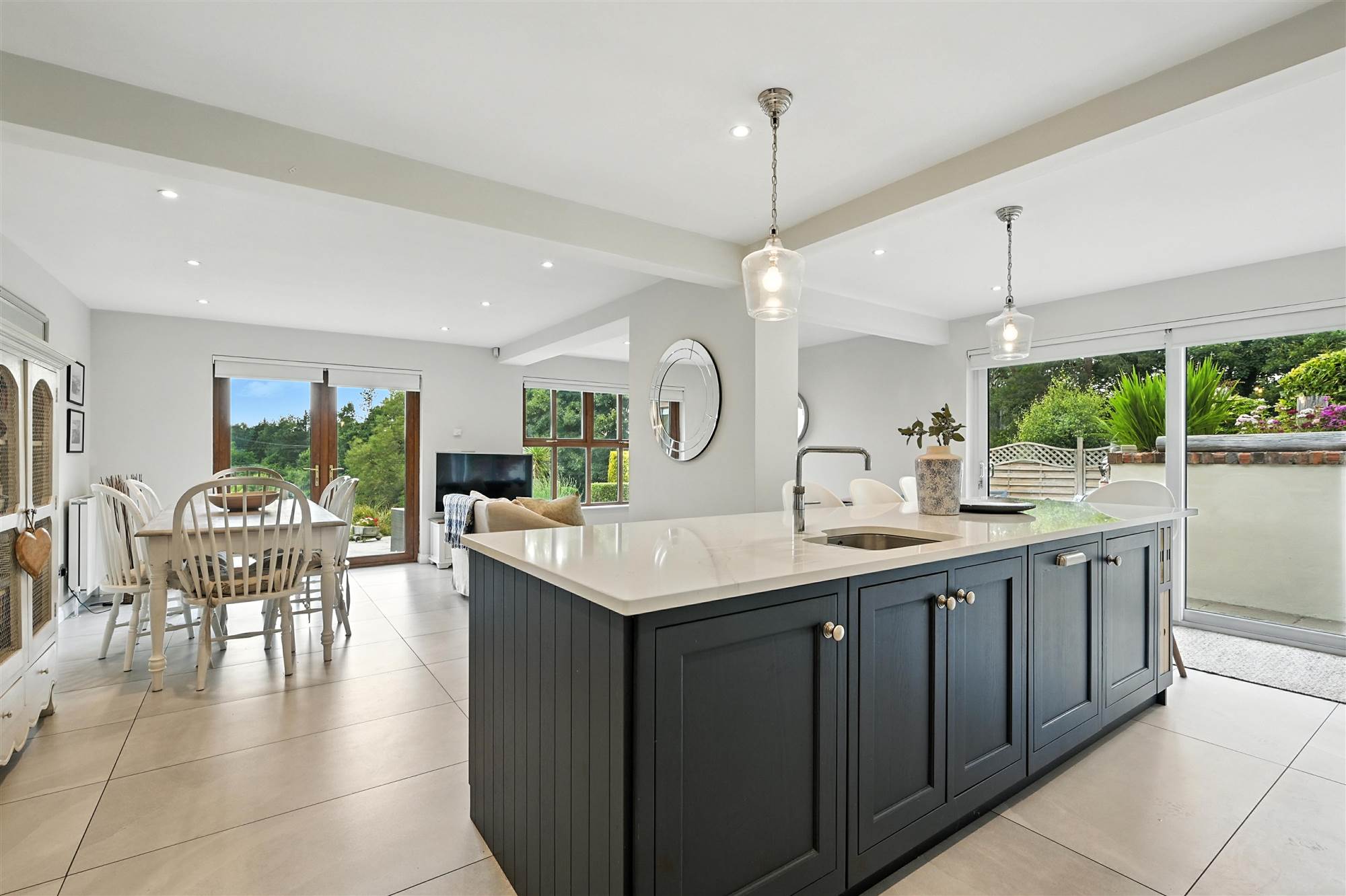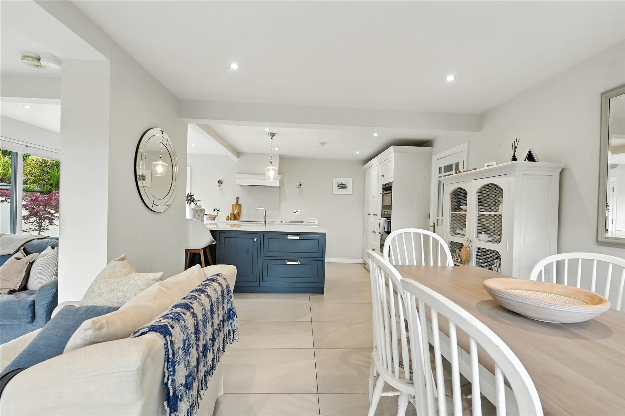 In frame solid wood luxury Shaker style kitchen, full range of pull-out drawers and cupboards including double larder unit and stainless steel vegetable drawers. Large island unit with complimentary marble worktops, upstands and splashback. Integrated appliances to include Quooker hotwater tap, dishwasher, electric hob, self- cleaning electric oven, combination microwave/oven, warming drawer, tall upright fridge, under counter freezer. Fully tiled floor, extensive use of recess lighting and wall/pendant lighting, motorised blinds to windows and doors. Contemporary Charnwood multi fuel stove to the living area and patio doors from the dining area to the front south-facing garden with extensive seating areas. Sliding doors to the south-west leading to Al fresco dining area with electric heater.