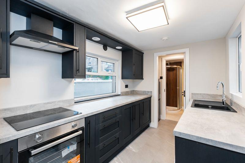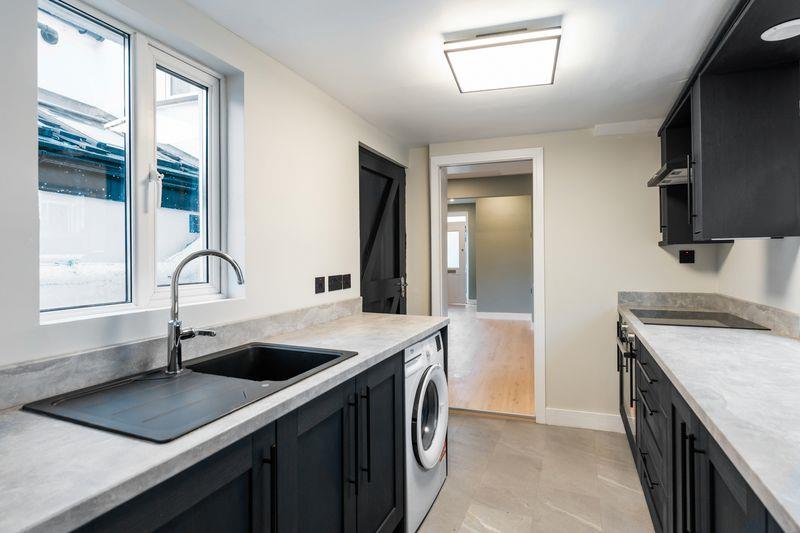 Range of navy high and low level cupboards and drawers with square edged work surfaces. Built-in Beko 4 ring hob and oven under. Extractor hood with integrated fan and light. Ceramic single drainer sink unit with mixer taps. Plumbed for washing machine. LVT flooring.