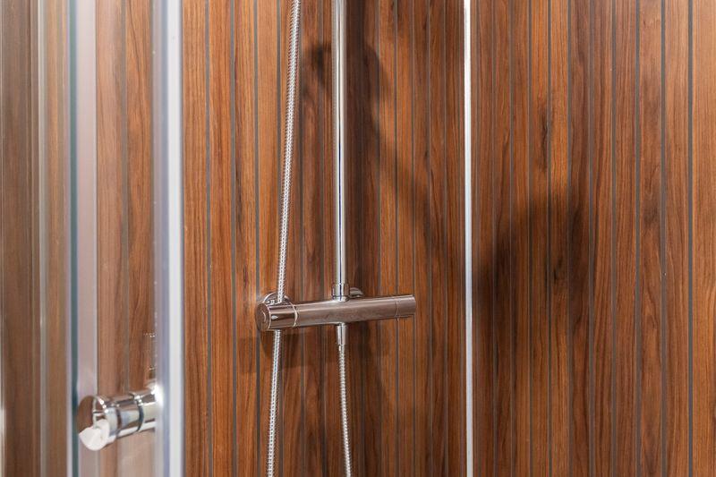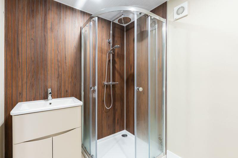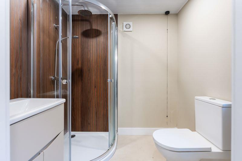 Quadrant shower enclosure with drencher and thermostatic shower. Vanity unit with inset wash hand basin and mixer taps. W.C. LVT flooring. Built-in extractor fan. 2 Downlights. Black heated towel rail.