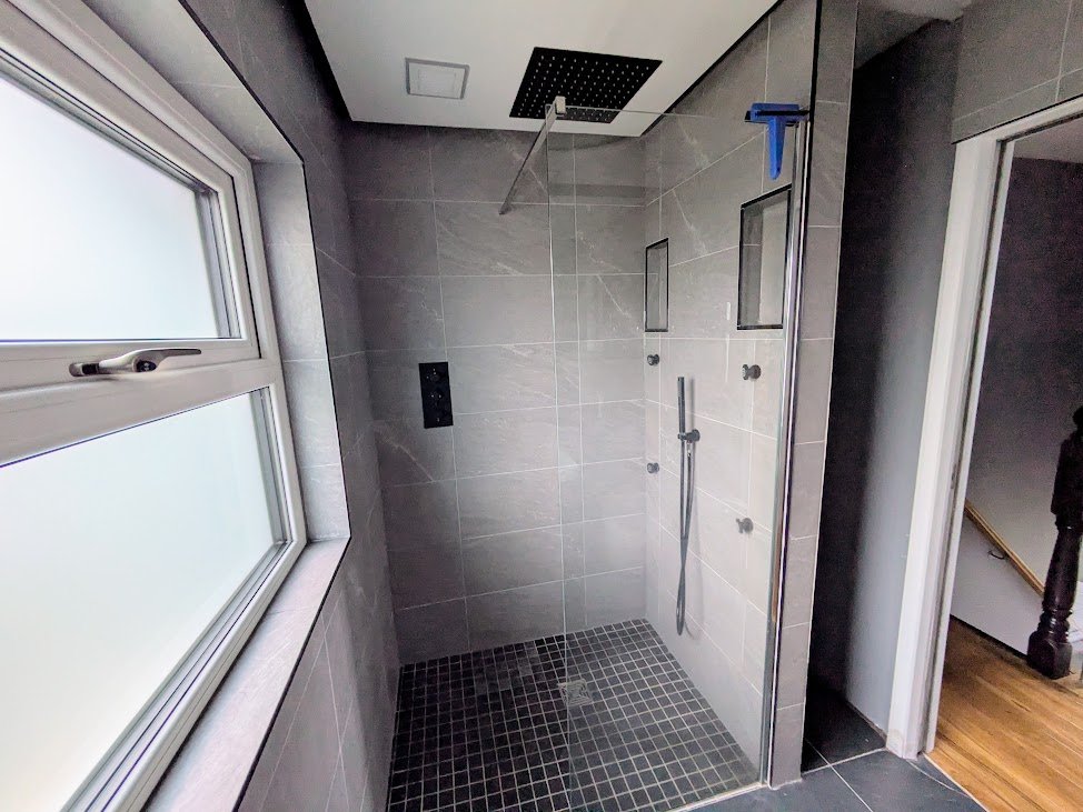 Luxury white suite, fully tiled walk in shower cubicle, thermostatically controlled shower unit, additional rain shower and body jets, wall mounted dual flush wc, vanity sink unit with mixer taps, stainless steel heated towel rail, recessed spotlights, ceramic tiled floor, fully tiled walls.
