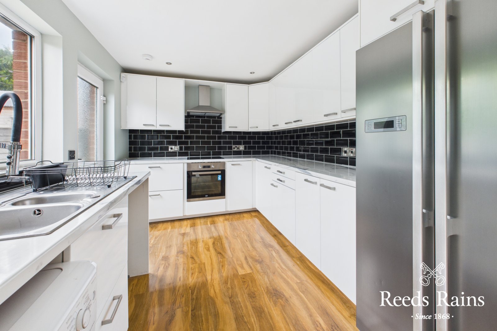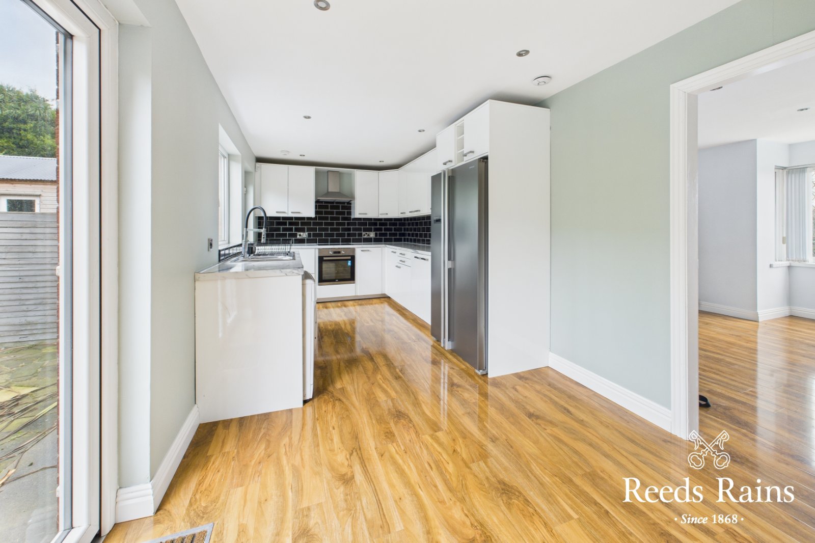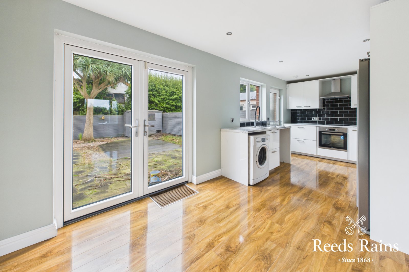 Single drainer 1.5 stainless steel sink unit with mixer taps, laminate work surfaces, excellent range of high and low level units, built in oven, 4 ring ceramic hob, stainless steel chimney extractor fan, plumbed for washing machine, fridge space, recessed spotlights, upvc double glazed door to garden. Open to dining area, laminate wooden floor, upvc double glazed french doors to garden.