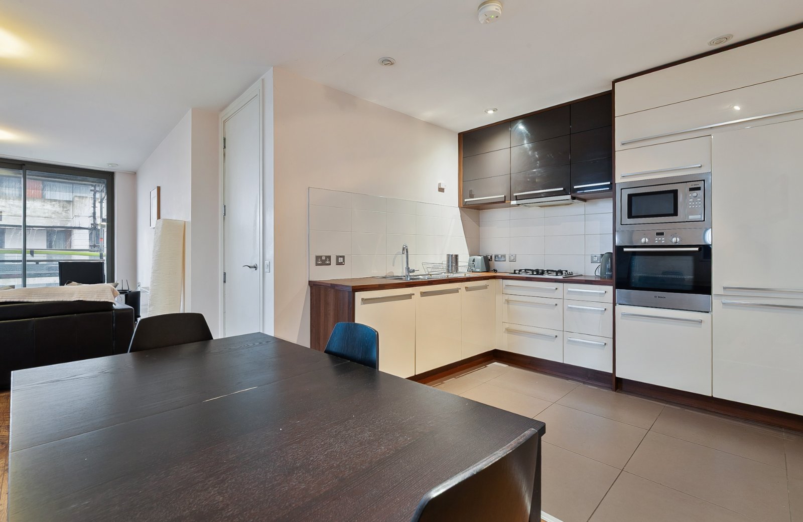 Open plan kitchen / living with laminate flooring meeting the tile floored kitchen. The room has neutral décor and provides outdoor space in the form of a balcony looking over the famous Titanic shipyard. The kitchen itself is fully fitted with units high and low, built in fridge freezer, dishwasher, oven and 4 ring gas hob and microwave. Sliding door to walk out balcony.