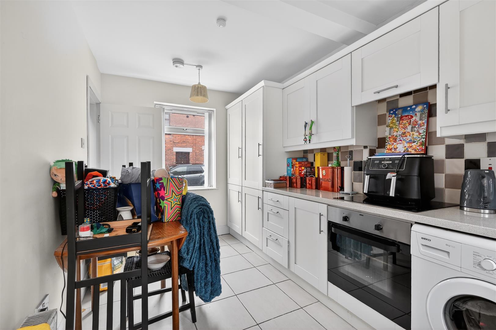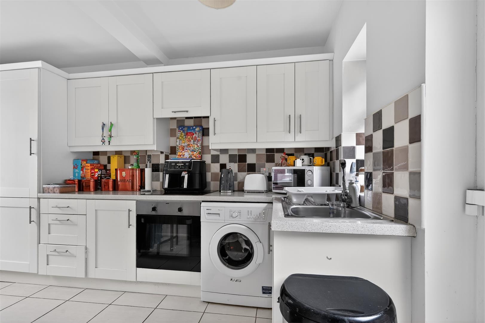 Modern range of high and low level units, integrated fridge / freezer, plumbed for washing machine, integrated oven with 4 ring electric hob, concealed extractor fan, single drainer stainless steel sink unit with mixer tap, tiled floor, part tiled walls.