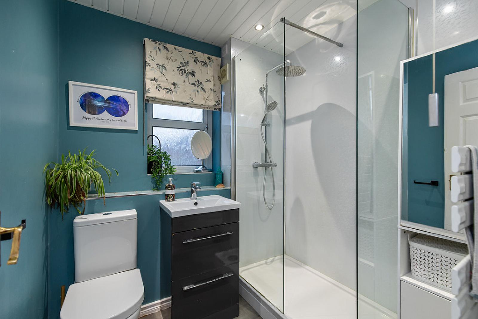 SHOWER ROOM White suite comprising low flush WC, vanity unit with storage, walk in shower cubicle with rainwater shower, panelled walls, heated towel rail, panelled ceiling, low voltage spotlights.