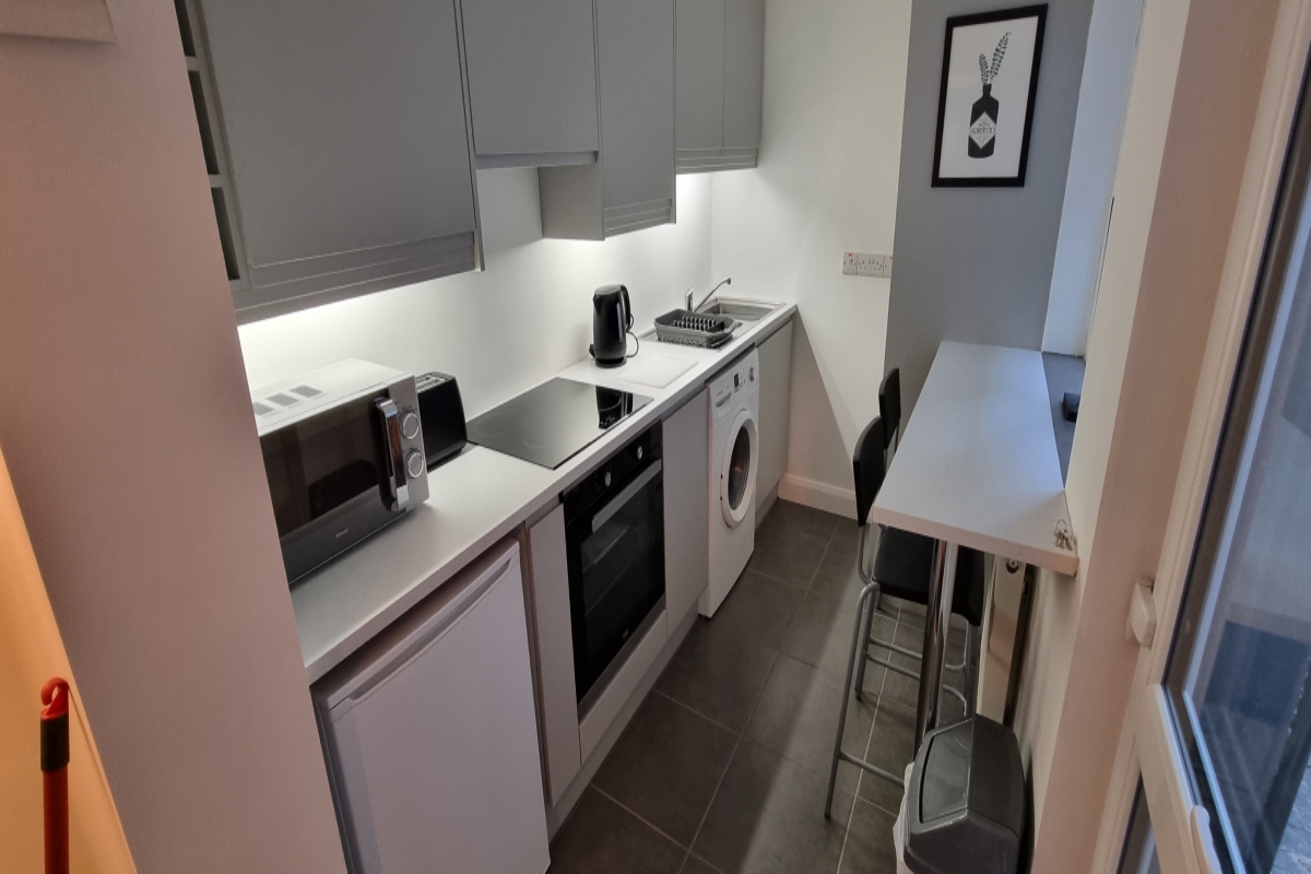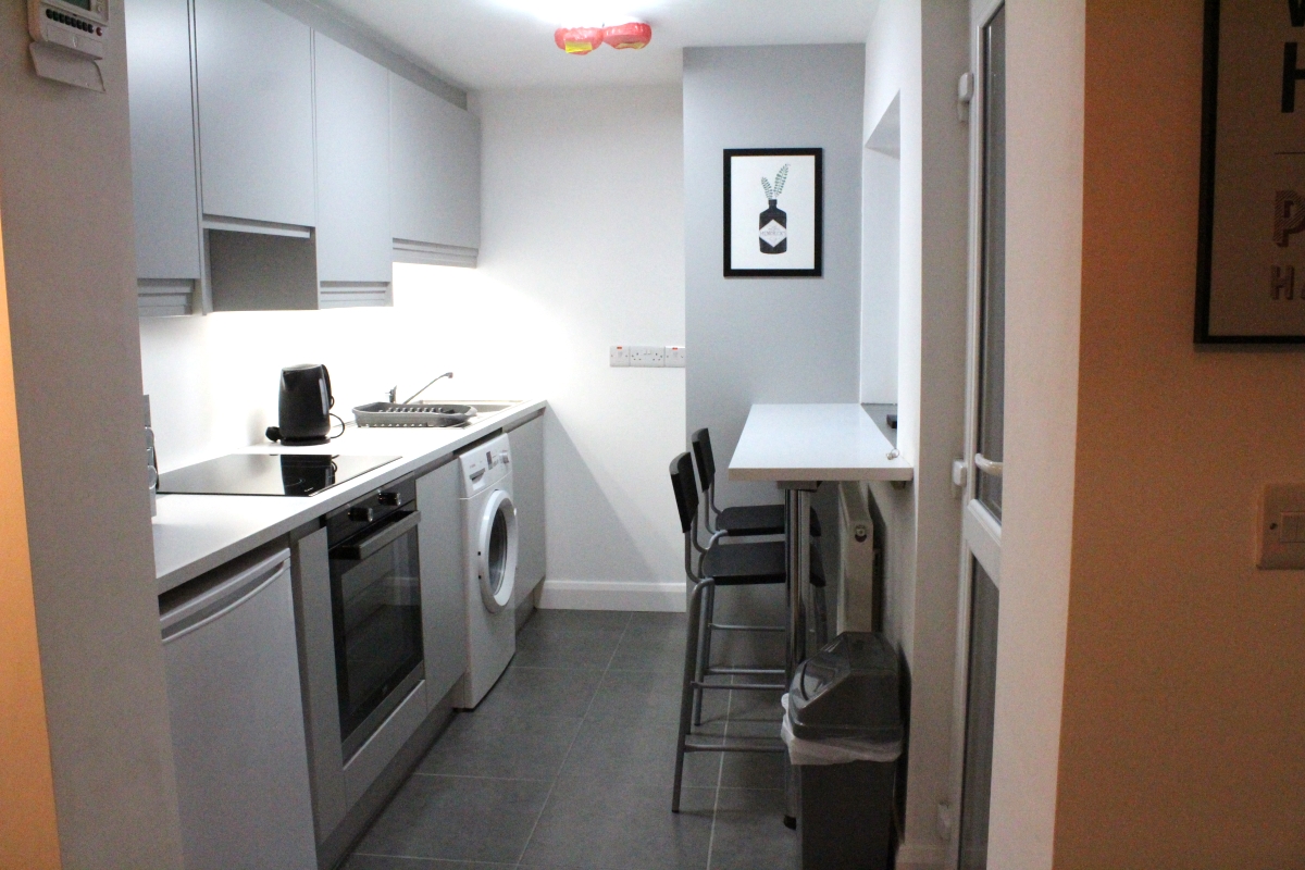 Pale grey shaker style kitchen with ample wall and floor units. Worksurfaces. Recessed and under cupboard lighting. Stainless streel single oven and 4 ring ceramic hob. Integrated fan and fridge freezer. Washing machine. Ladder style radiator. Laminate wood effect flooring.