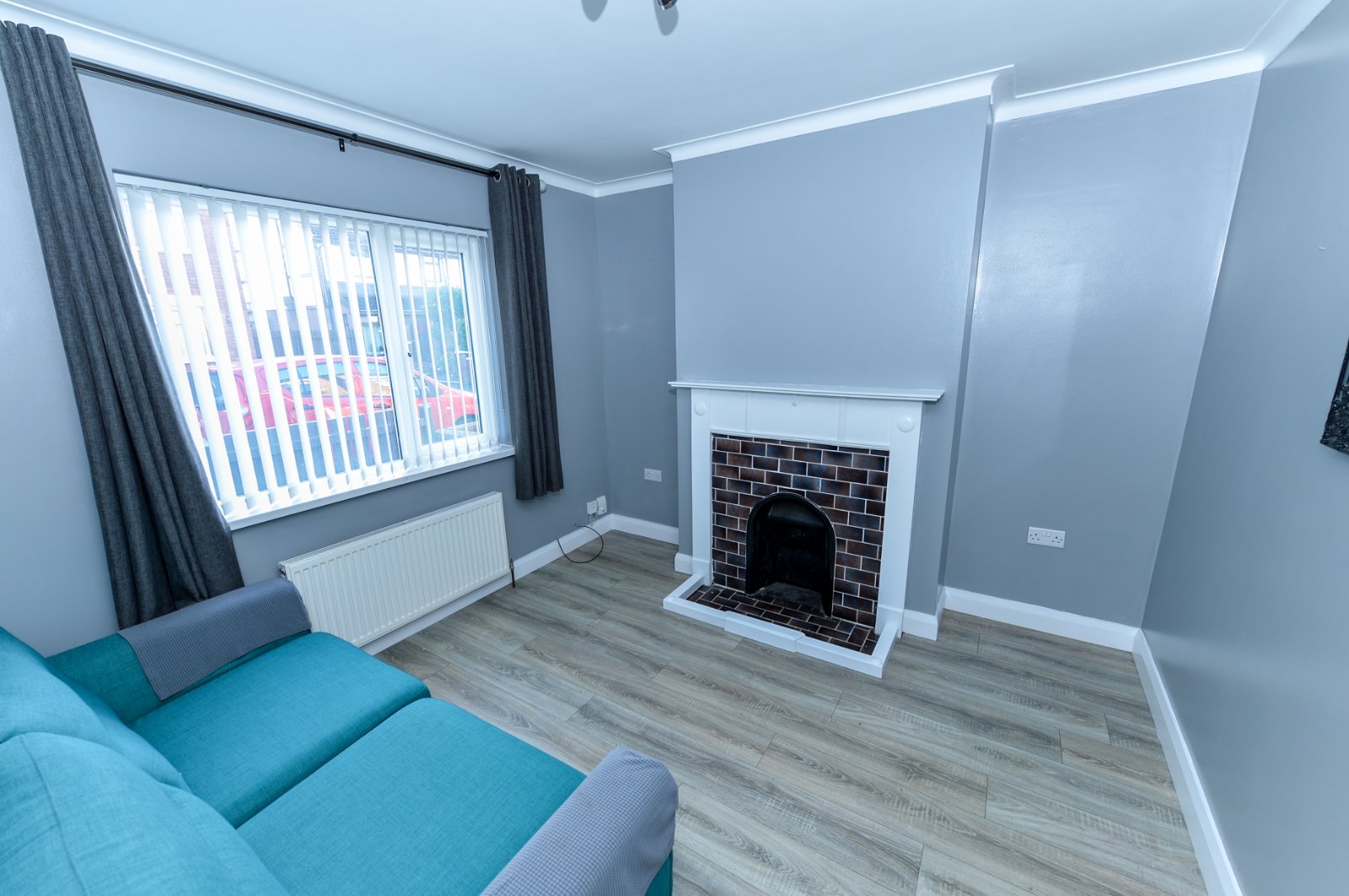 Recently decorated living room with tiled fireplace. Cornice ceiling. Radiator.
