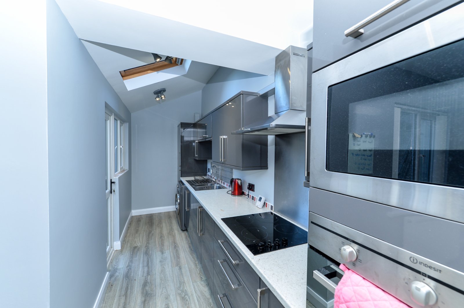Excellent range of wall and base level soft closing units with granite effect work surfaces. One bowl sink unit with chrome dual mixer tap. Integrated four ring electric hob and eye level stainless steel oven. Integrated microwave. Overhead stainless steel chimney style extractor hood, washing machine and fridge/freezer. Storage cupboard. Laminate flooring. Recessed lighting. Upvc door to enclosed private rear yard. Velux windows.