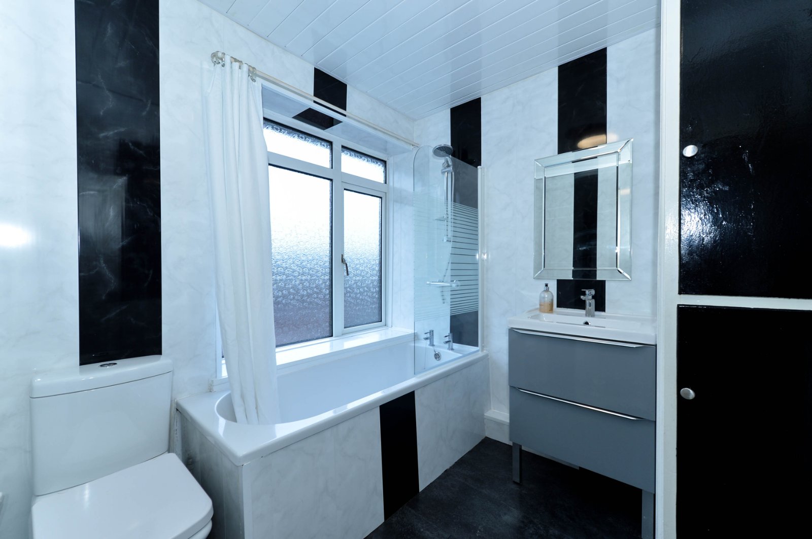 With modern white suite, panelled bath with thermostatically controlled shower, dual flush close coupled WC, vanity unit with mixer taps, PVC wall covering, tiled effect floor, PVC tongue and groove ceiling, gas boiler.