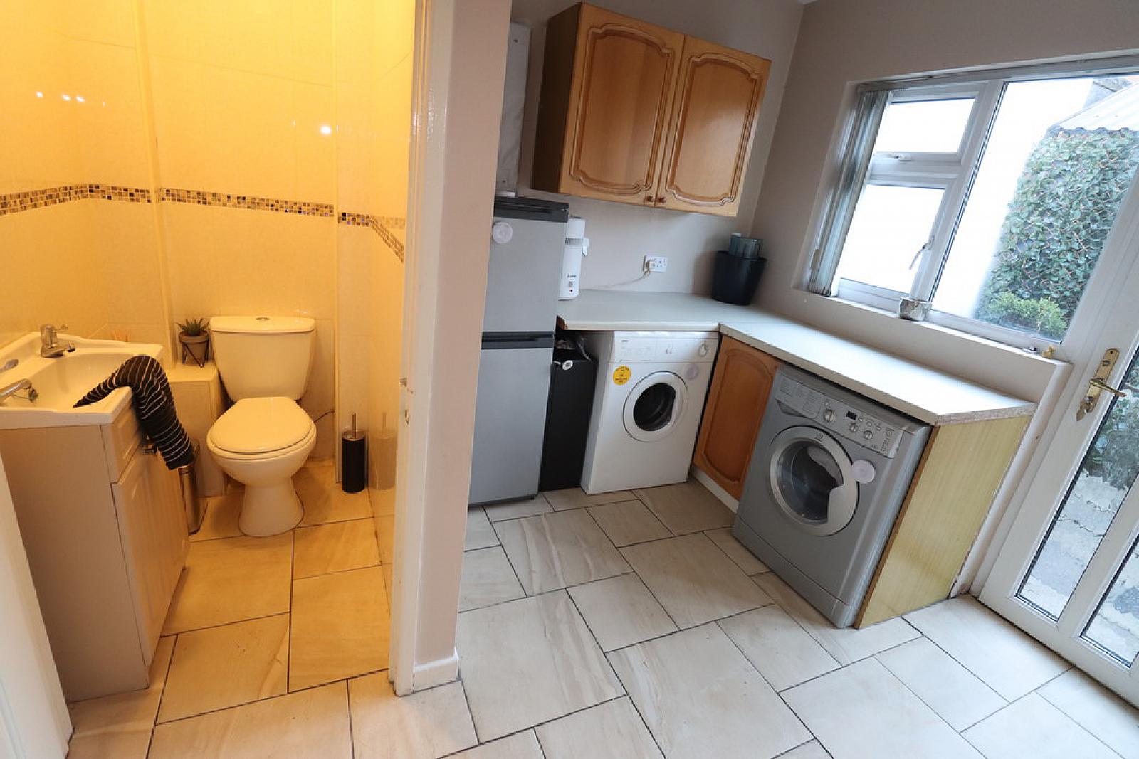 DOWNSTAIRS W/C Low flush WC, vanity sink unit, ceramic tiled flooring, wall tiling