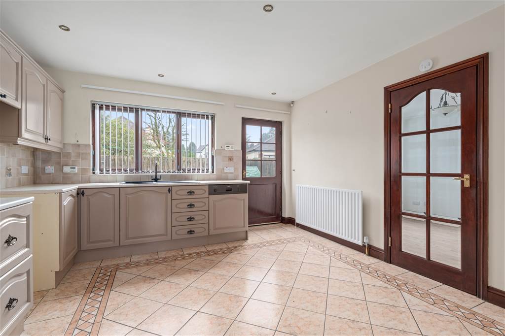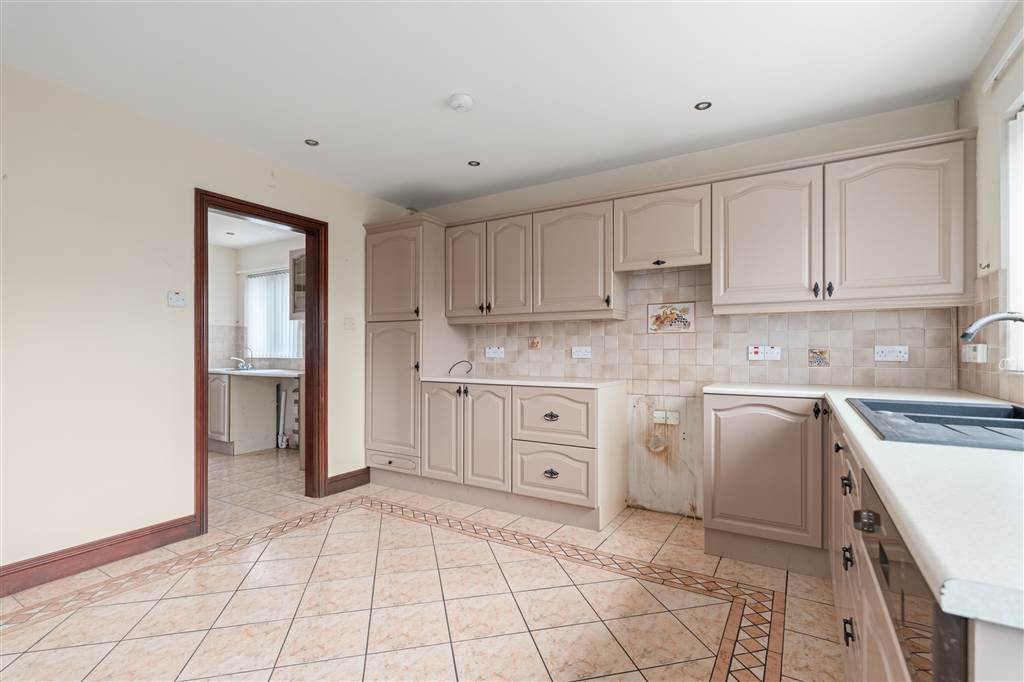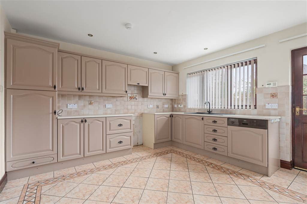 With a range of eye and low-level fitted units, 1 1/4 bowl sink unit and drainer with mixer tap. Space for four ring electric hob and oven with extractor fan over. Integrated fridge. Integrated dishwasher. Larder cupboard. Cutlery drawers. Saucepan drawers. Spot lighting to ceiling. Splash back tiling. Tiled flooring. Hardwood door to rear.