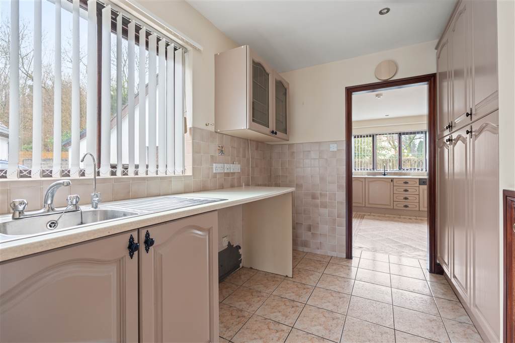 With a range of fitted units, stainless-steel sink unit and drainer with stainless-steel mixer tap. Plumbed for washing machine. Space for tumble dryer. Glazed display cupboards. Spot lighting to ceiling. Part tiled walls. Tiled flooring.