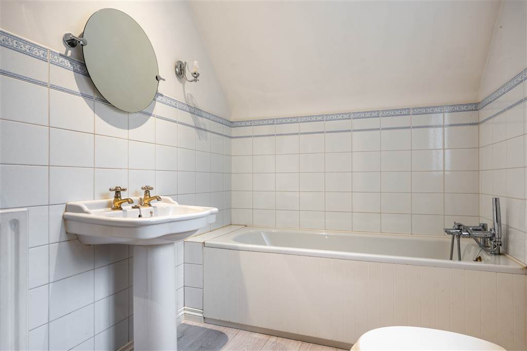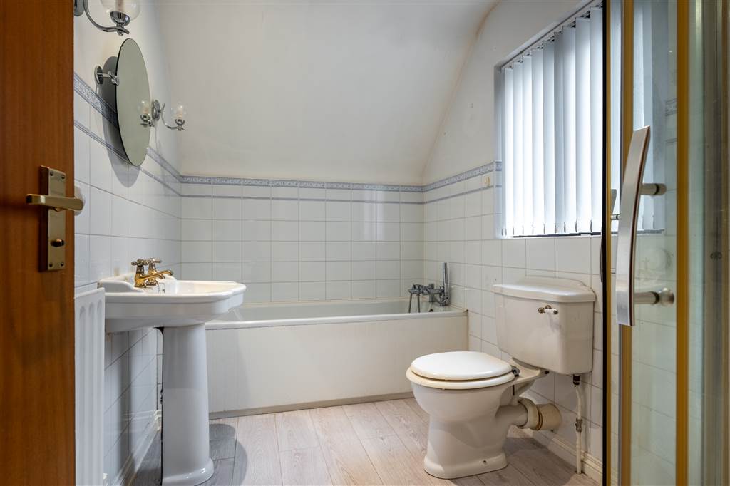 With 4-piece white suite comprising LFWC, WHB, panelled bath with hand-held shower head and shower to enclosed corner cubicle. Wall lights. Part tiled walls.