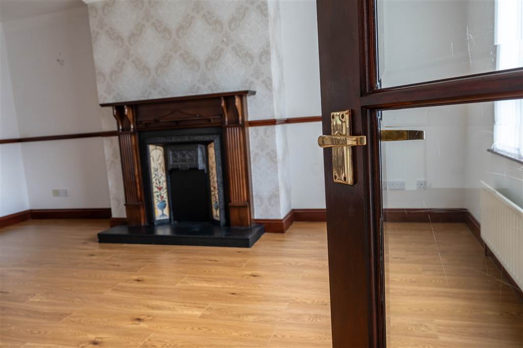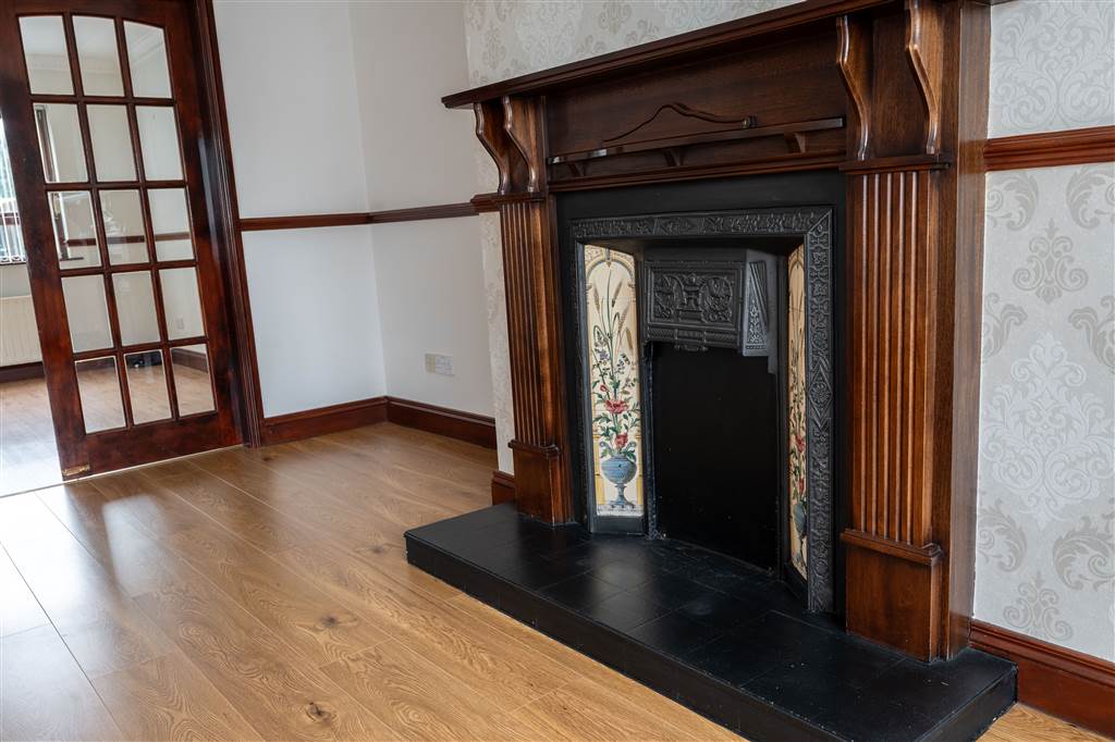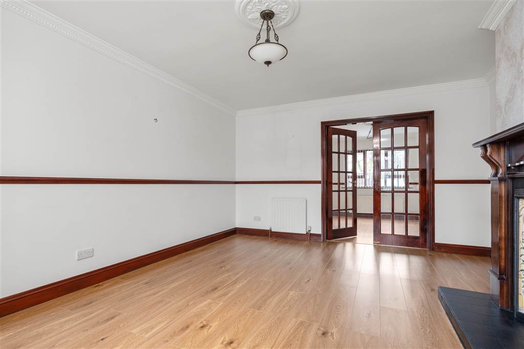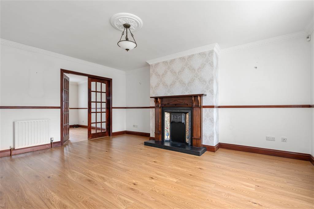 With cast-iron fireplace to tiled hearth, wooden surround and mantle. Dado rail. Coving to ceiling. Ceiling rose. Laminated wooden flooring. Glazed double doors to dining room.