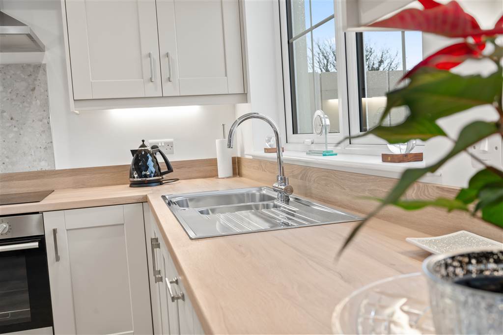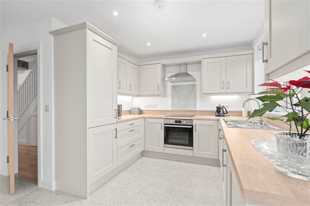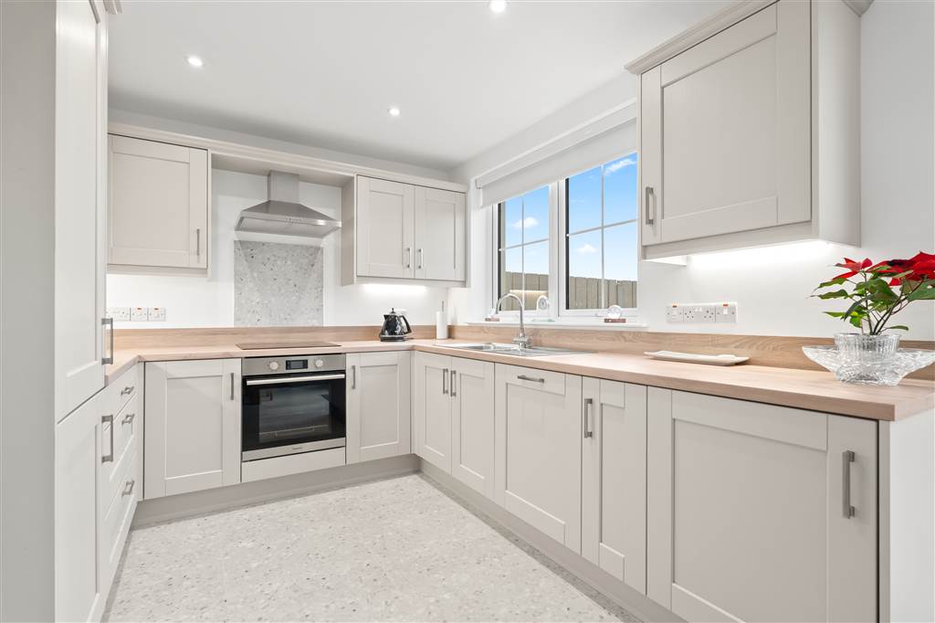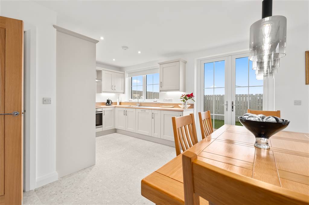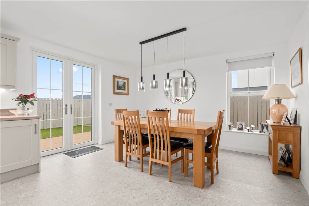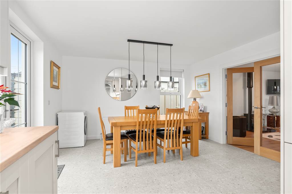 With a range of eye and low-level fitted units, 1 1/4 bowl stainless-steel sink unit and drainer with stainless-steel mixer tap. Integrated four ring electric hob and oven with stainless-steel extractor fan over. Integrated fridge-freezer. Integrated dishwasher. Cutlery drawer. Saucepan drawers. Under cabinet lighting. Spacious area for dining with feature lighting. PVC double doors to rear. Spot lighting to ceiling. Tiled flooring.
