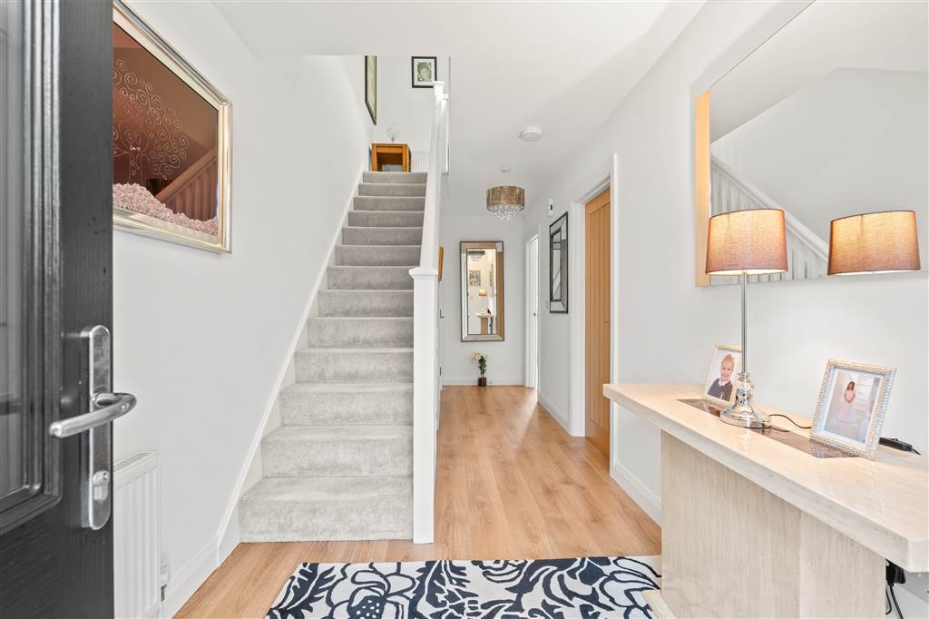 With composite front door with decorative glazed panes. Balustrade staircase to first floor. Under stair storage cupboard. Laminated wooden flooring.
