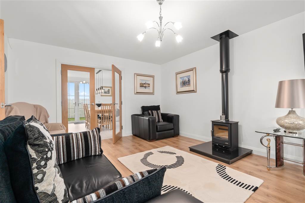 With Mazona multi-fuel burning stove to granite hearth. Laminated wooden flooring. Glazed double doors to kitchen/dining room.