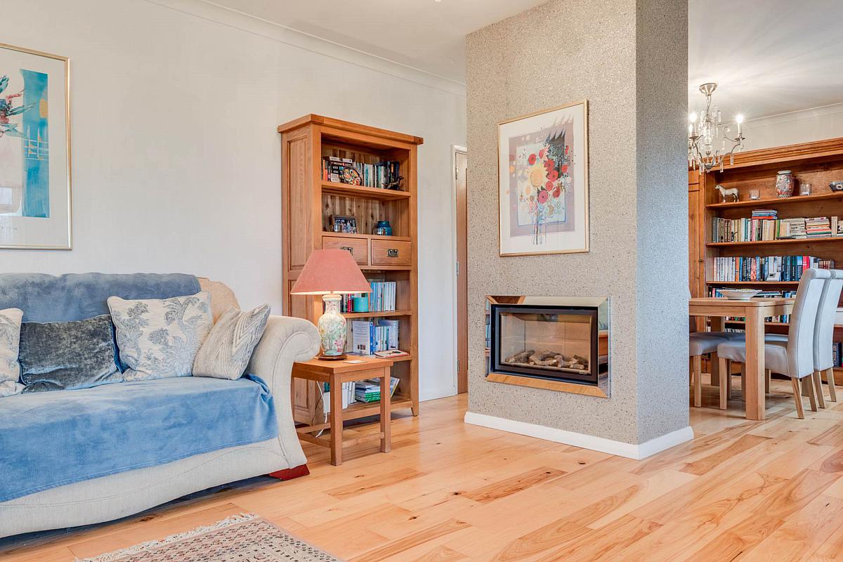 Spacious open plan lounge/dining room with feature central fireplace and hickory wood flooring.
