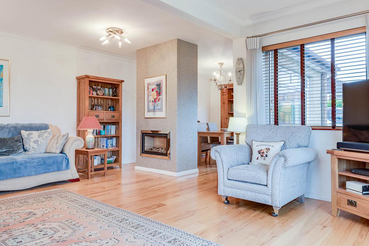 Solid hickory wood strip flooring. Central pillar style fireplace with contemporary glass fronted gas fire. Cornice ceiling. Door to